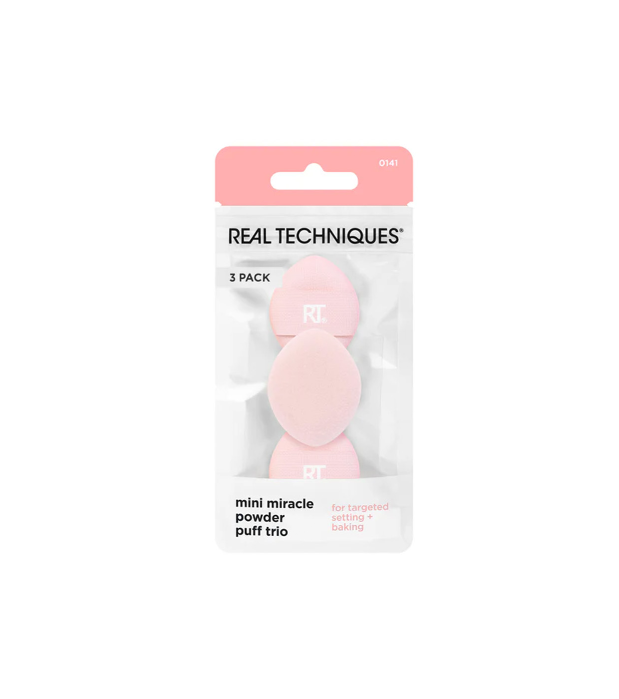 El trío Mini Miracle Powder Puff de Real Techniques te ofrece 3 esponjitas de tamaño mini diseñadas con su material de esponja para polvos más vendido para fijar y hornear de forma específica.