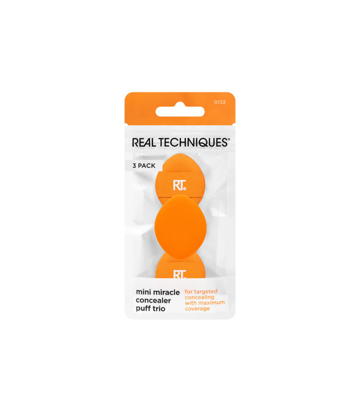 Real Techniques Mini Miracle Concealer Puff Trio te ofrece 3 mini esponjas en un nuevo material de esponja ultrasuave para ocultar y cubrir de forma especÃfica.