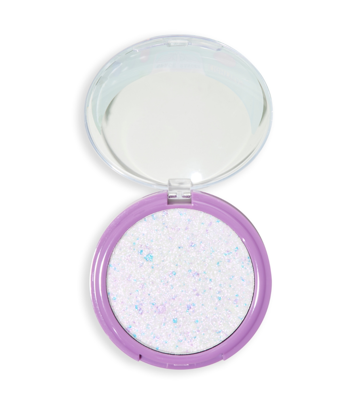 Este versátil iluminador en polvo Infinity Glitter Topper de Revolution puede usarse como topper en tus sombras de ojos o como un deslumbrante iluminador para la piel.