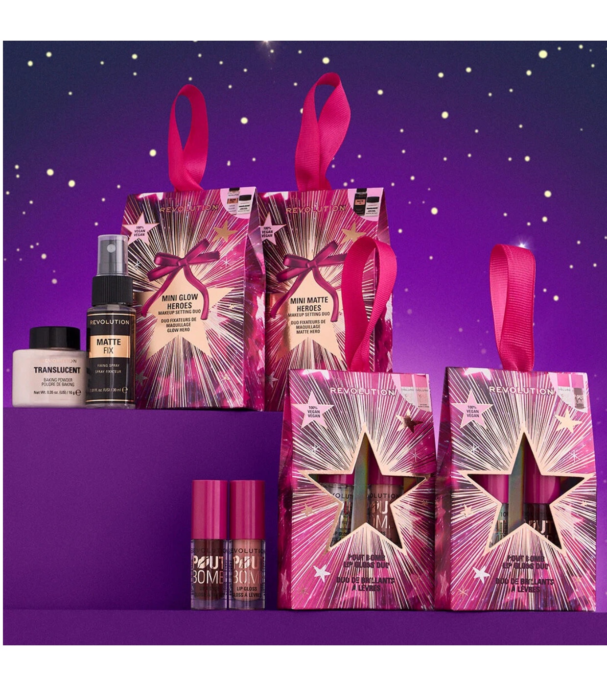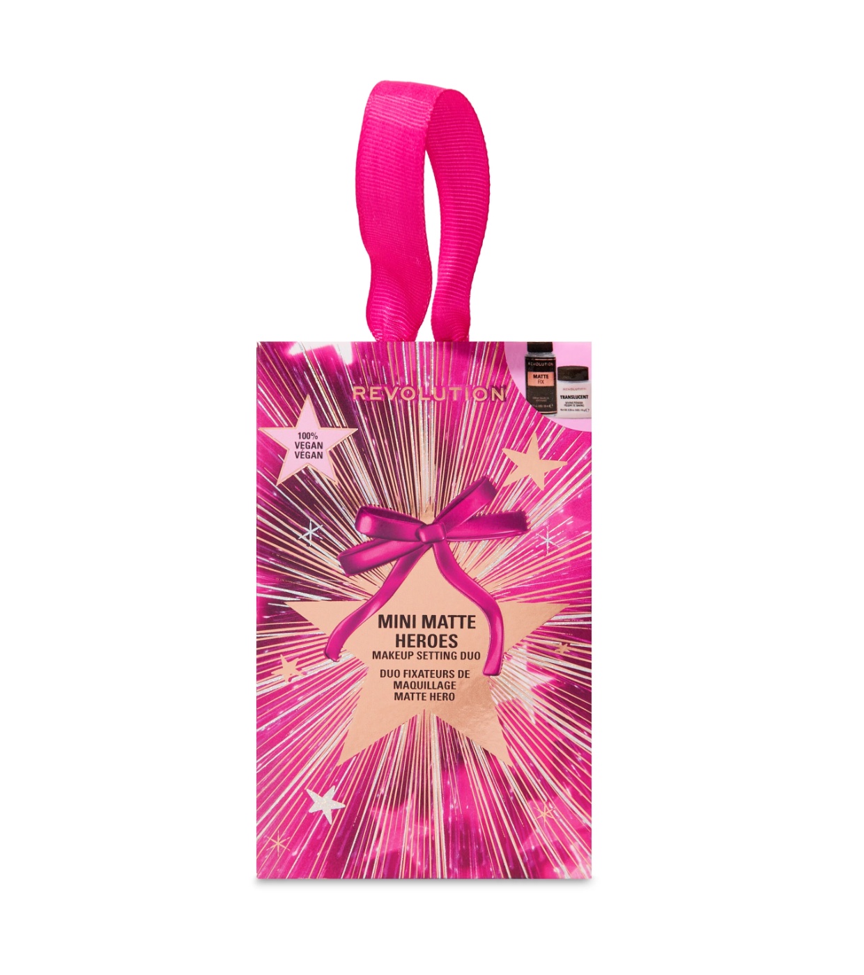 Conoce a tus héroes mate. El dúo Revolution Mini Matte Hero's Makeup Setting Duo incluye dos de nuestros productos mate imprescindibles más vendidos en tamaños perfectos para viajar.