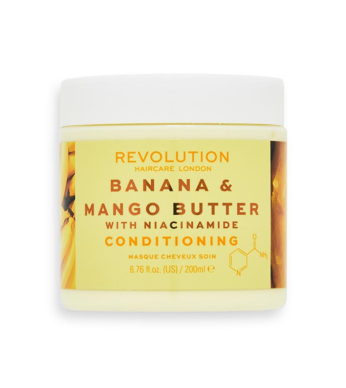 Esta mascarilla acondicionadora Banana & Mago Butter de Revolution Haircare formulada con platano, manteca de mango y niacinamida, nutre y acondiciona el cabello.