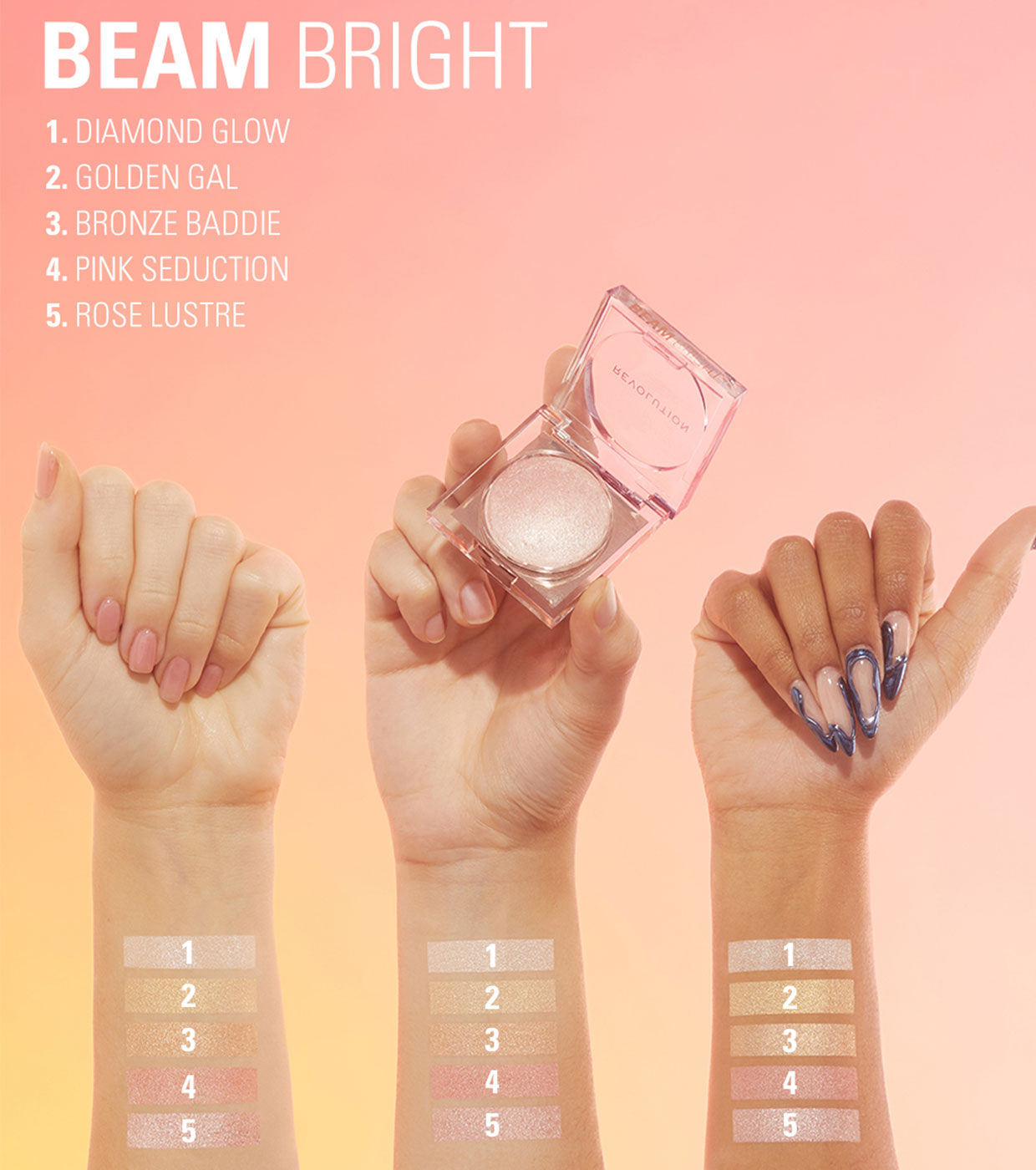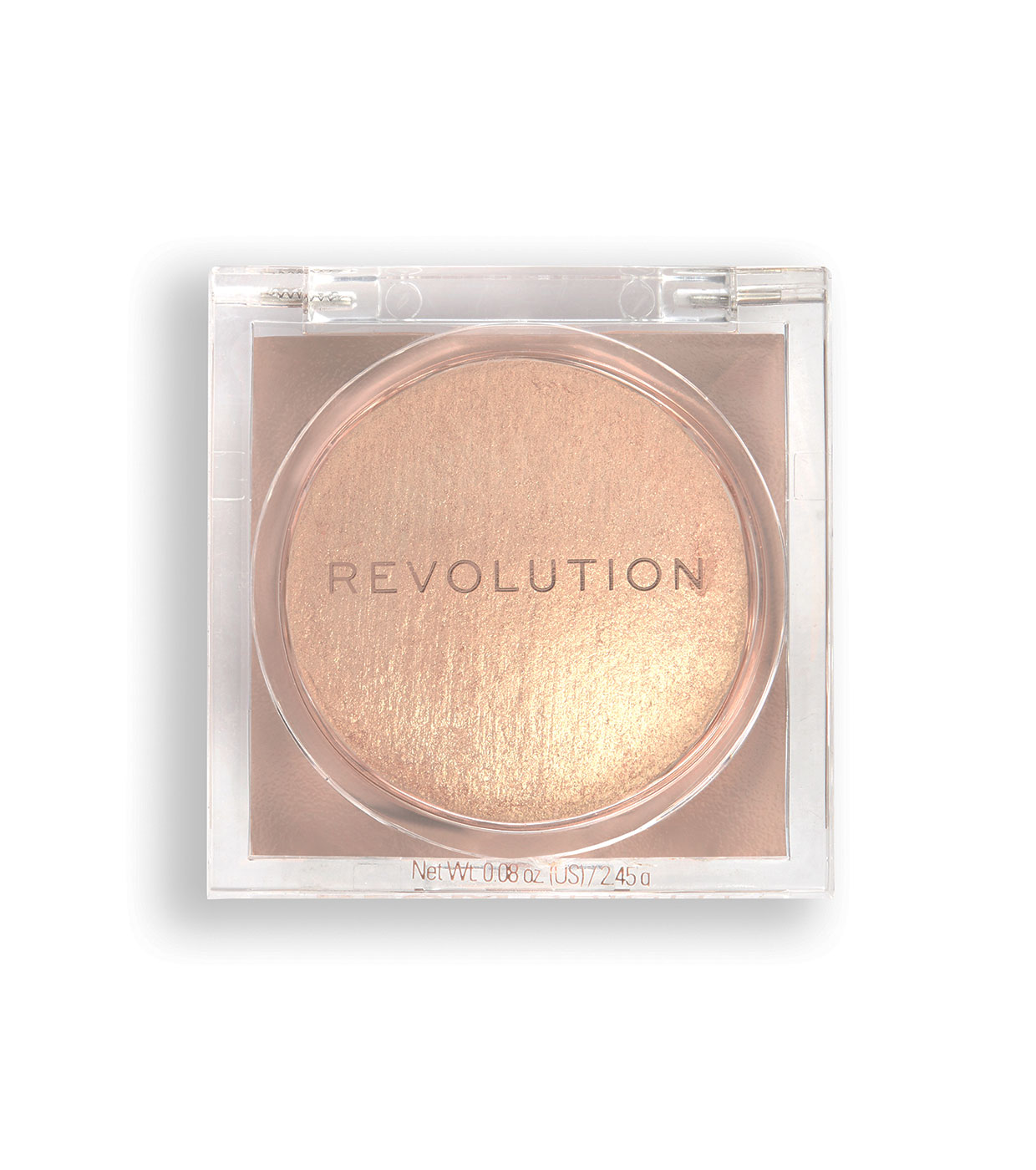 Descubre la magia de los iluminadores Revolution Beam Bright: un lujoso polvo sedoso que se funde en la piel, creando un resplandor suave y luminoso que evoca la hora dorada.