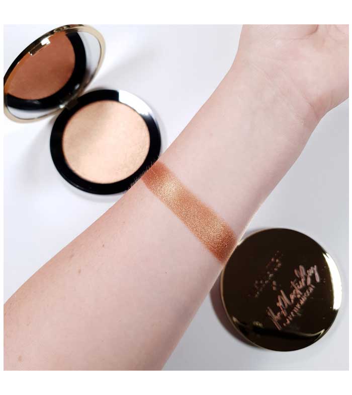 Este iluminador prensado reluciente en tono dorado brinda un sofisticado acabado de efecto mojado.