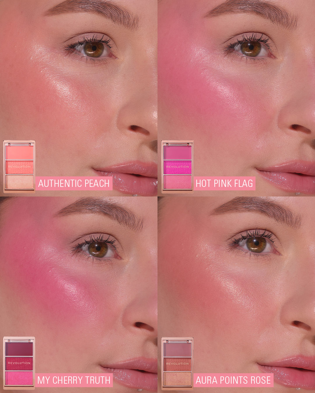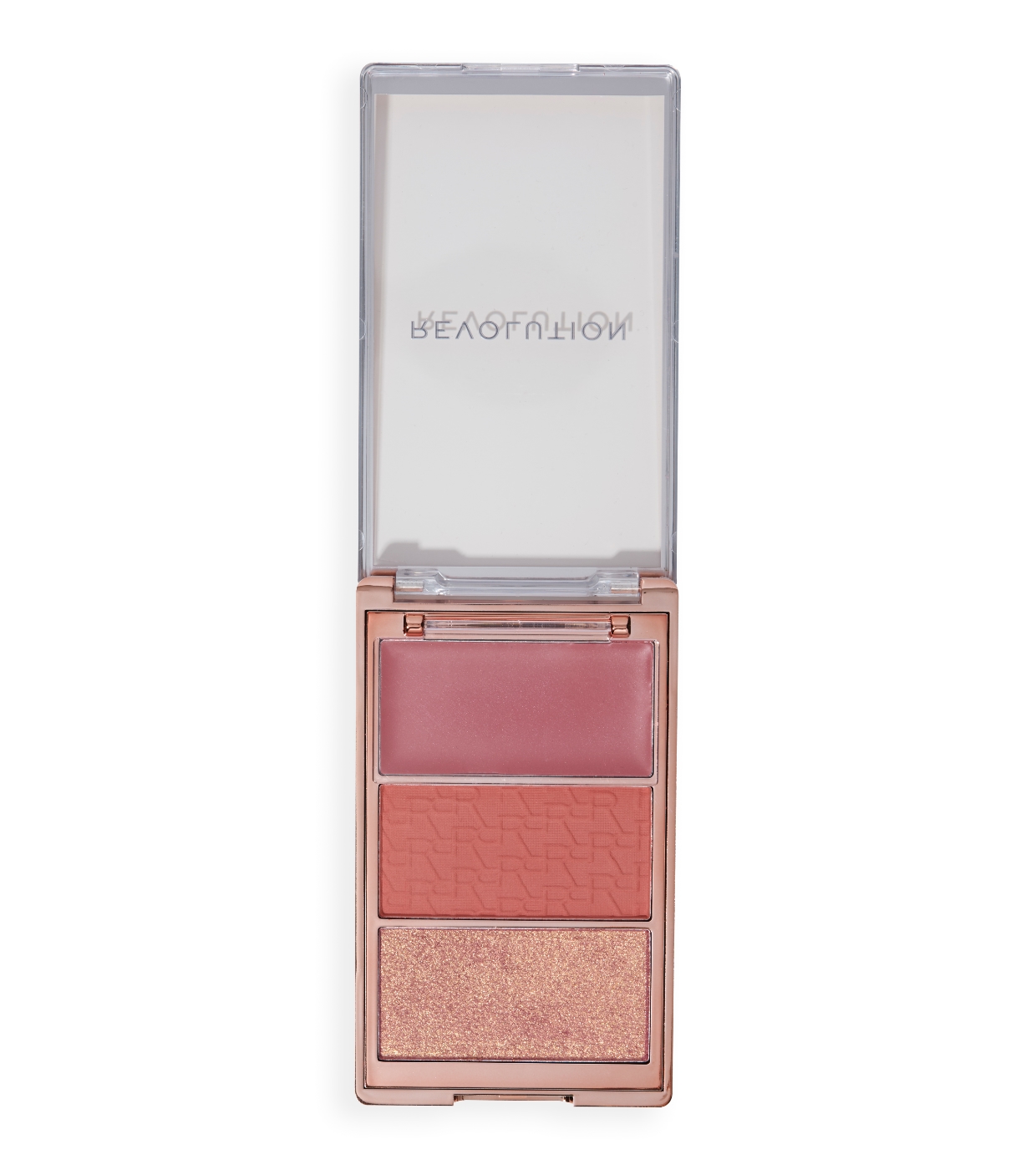 La paleta de coloretes Icon Blush de Revolution es un trío imprescindible con fórmulas en crema, mates y brillantes para un rubor que dura todo el día.