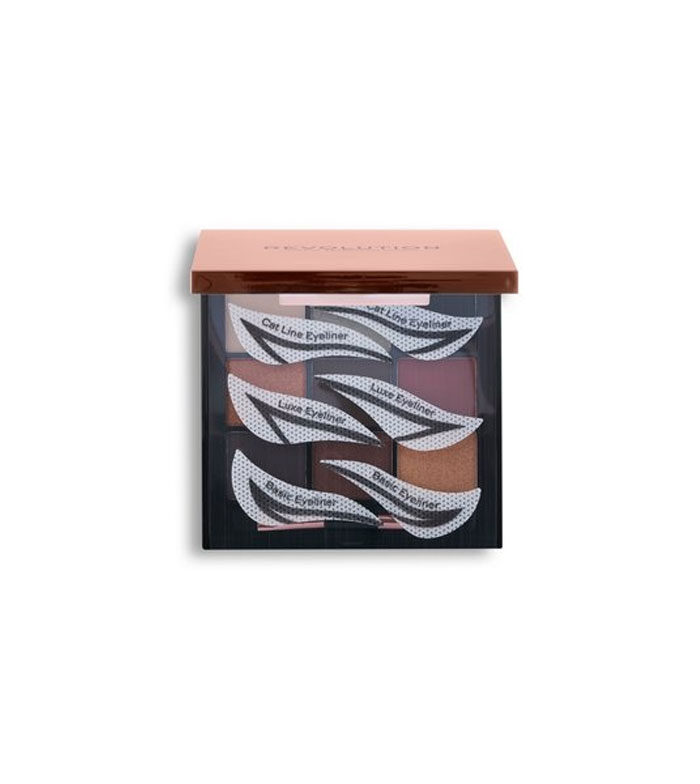 La paleta contiene 9 sombras en tonos neutros y oscuros, un aplicador de doble punta y unas plantillas para eyeliner.