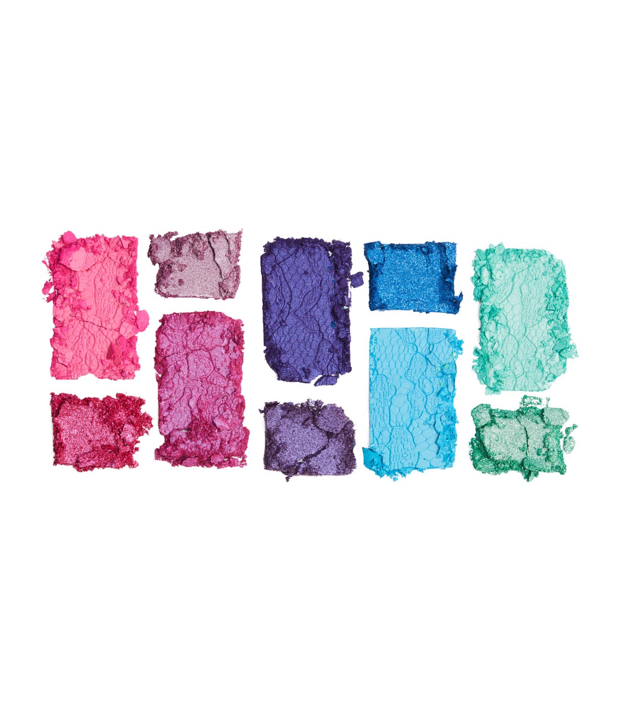 Esta paleta de sombras súper colorida se compone de 10 tonos desde ricos tonos mate azul y rosas a brillos morados y verdes.