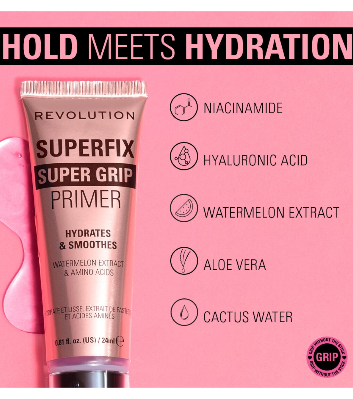 Descubre la Prebase de maquillaje Superfix Grip de Revolution, una prebase revolucionaria que combina hidratación intensa con un agarre duradero para un maquillaje impecable durante todo el día.
