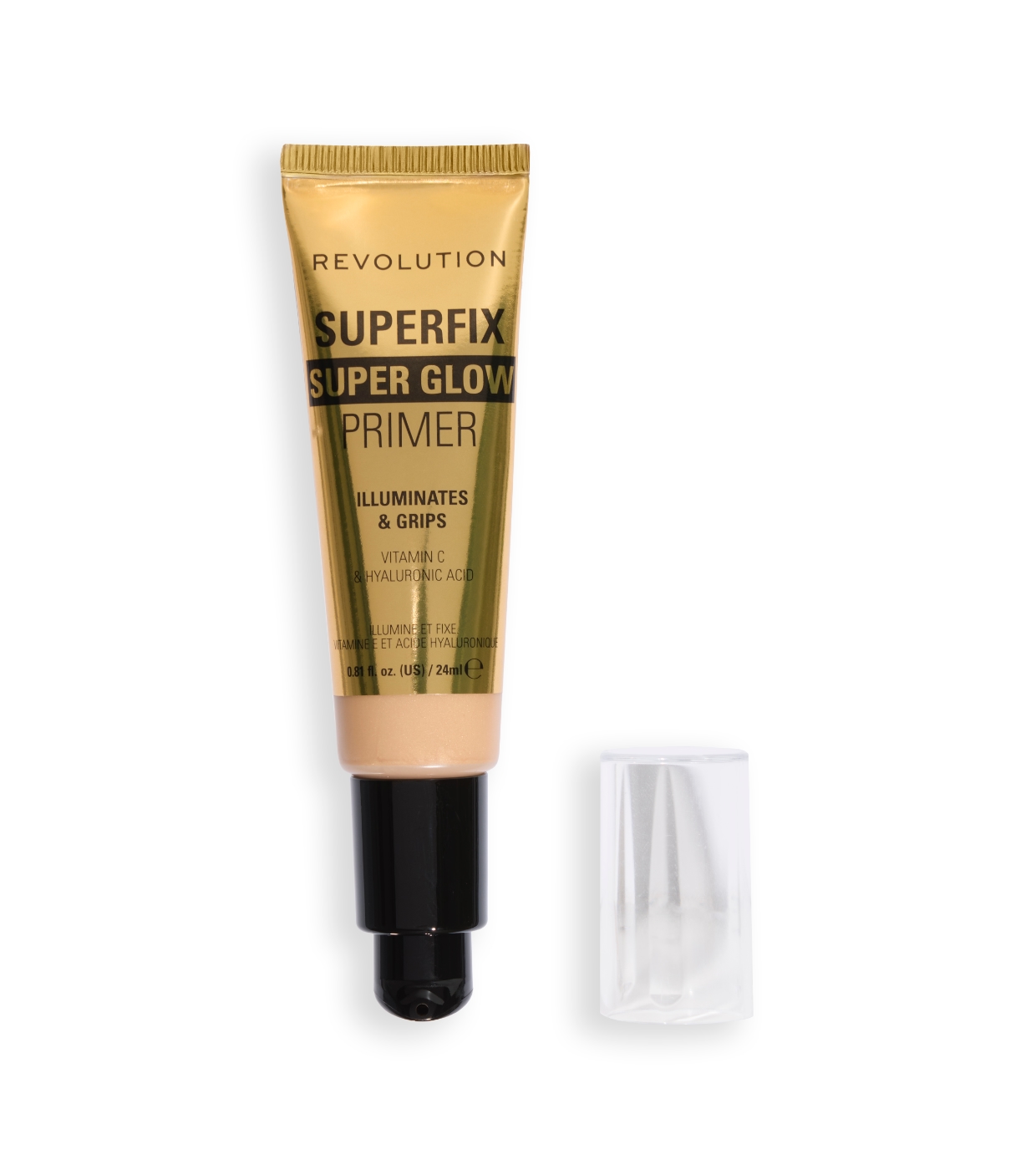 Consigue un acabado radiante y duradero con la Superfix Super Glow Primer de Revolution, una prebase todo en uno que ilumina y fija el maquillaje con un toque de glow saludable.