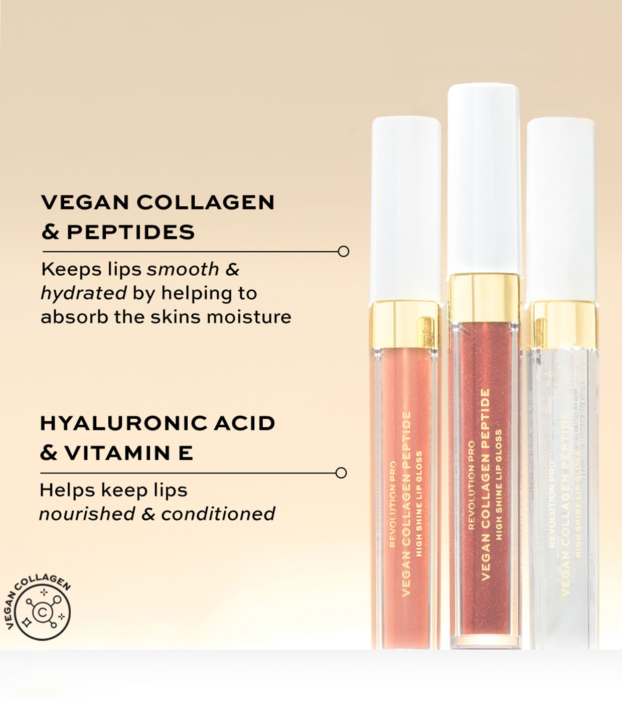 Nutre e hidrata tus labios con el brillo de labios Revolution Pro Vegan Collagen Peptide High Shine Lip Gloss.