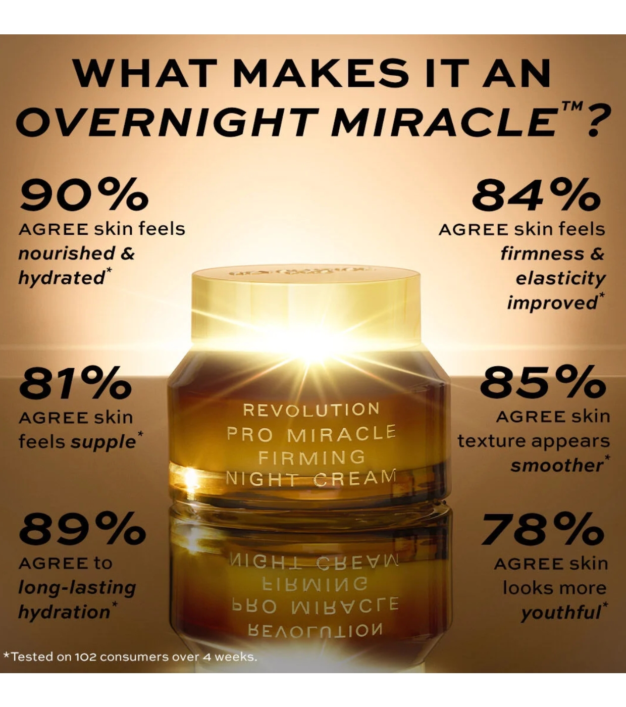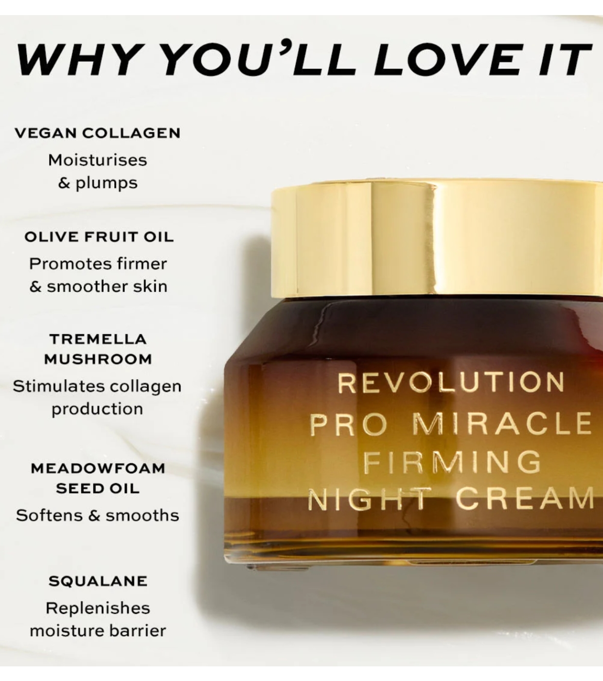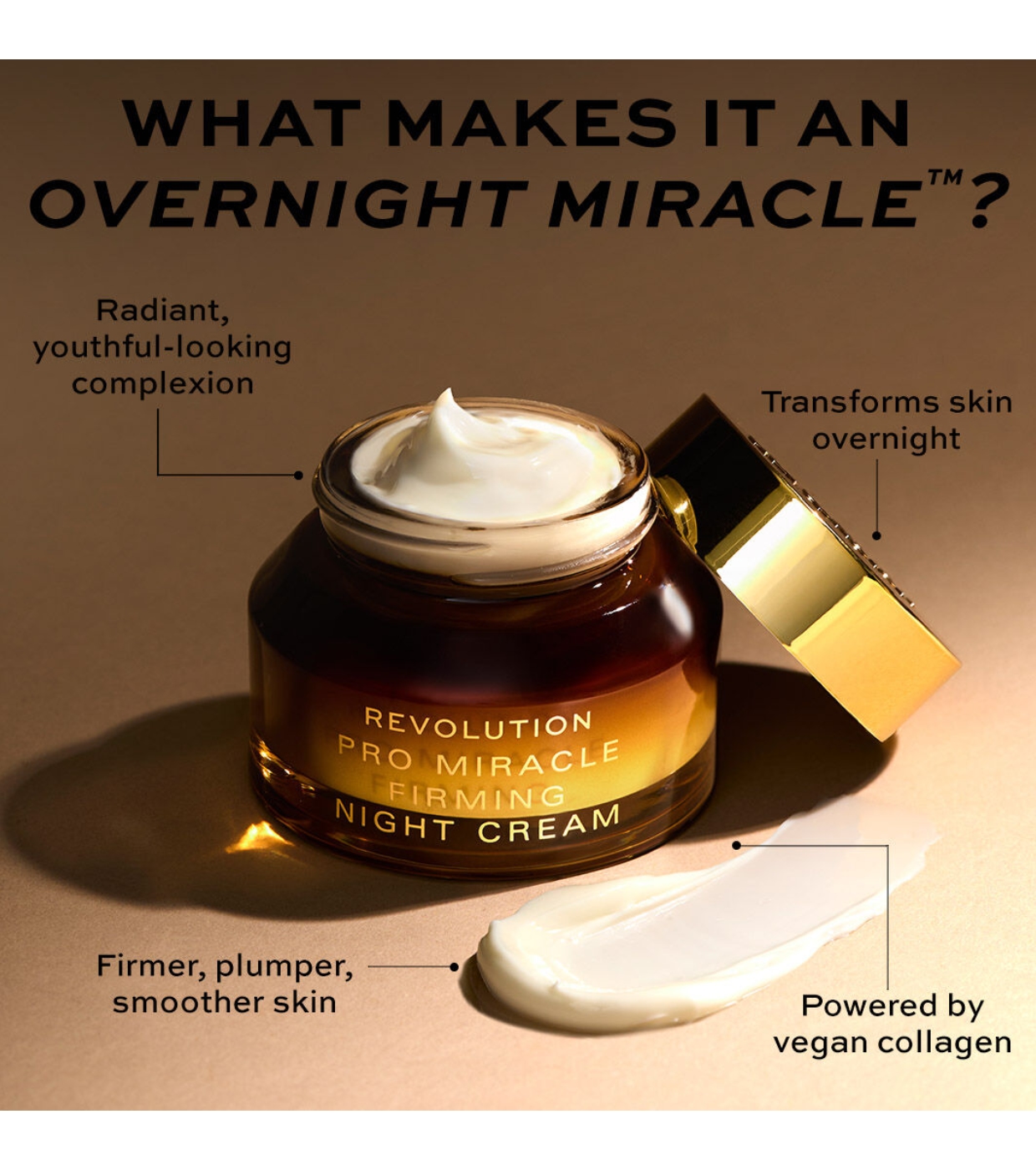 Un potente hidratante nocturno, inspirado en nuestra número 1 en ventas, la crema de noche con colágeno Miracle Firming de Revolution Pro.