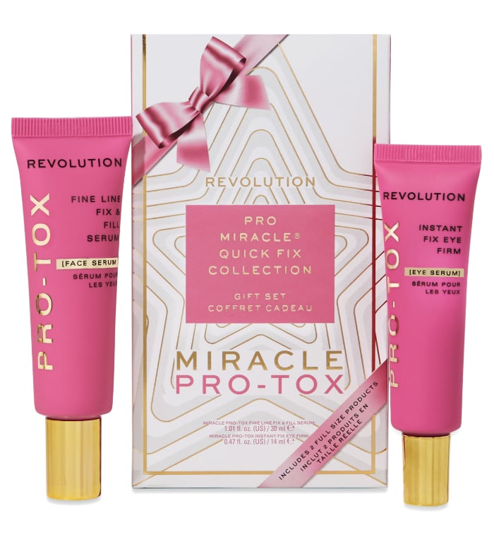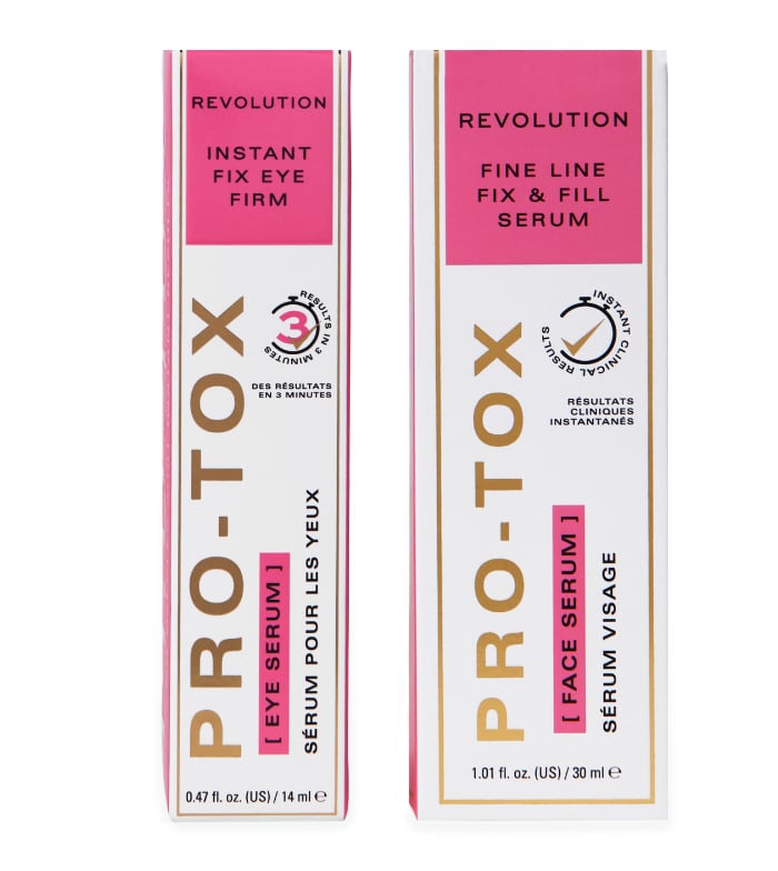 Con dos fórmulas en tamaño completo impulsadas por nuestro complejo de nueva generación Pro-Tox Complex, la colección Revolution PRO Miracle® Pro-Tox ofrece resultados instantáneos de alisado, lifting e hidratación - sin agujas ni tiempo de recuperación.