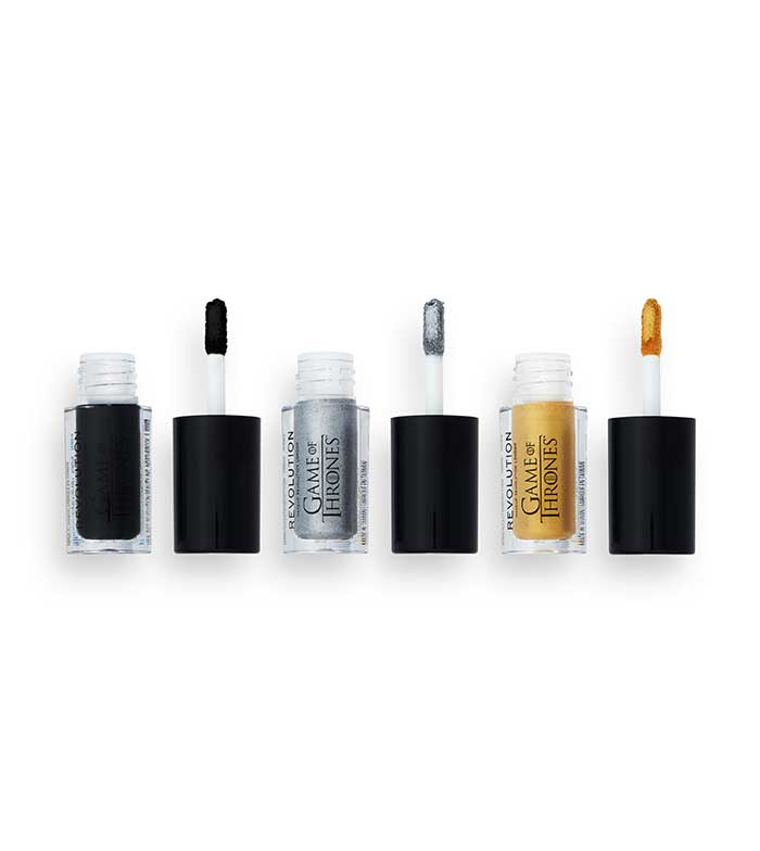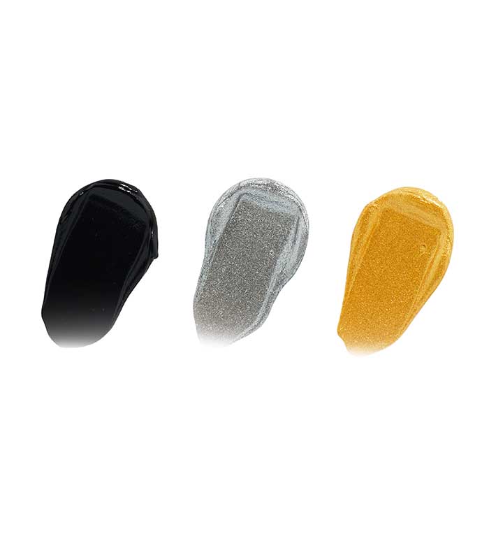 Este kit de sombras dignas de la realeza, incluye 3 sombras líquidas superpigmentados y ultrabrillantes en tonos oro, plata y negro mate.