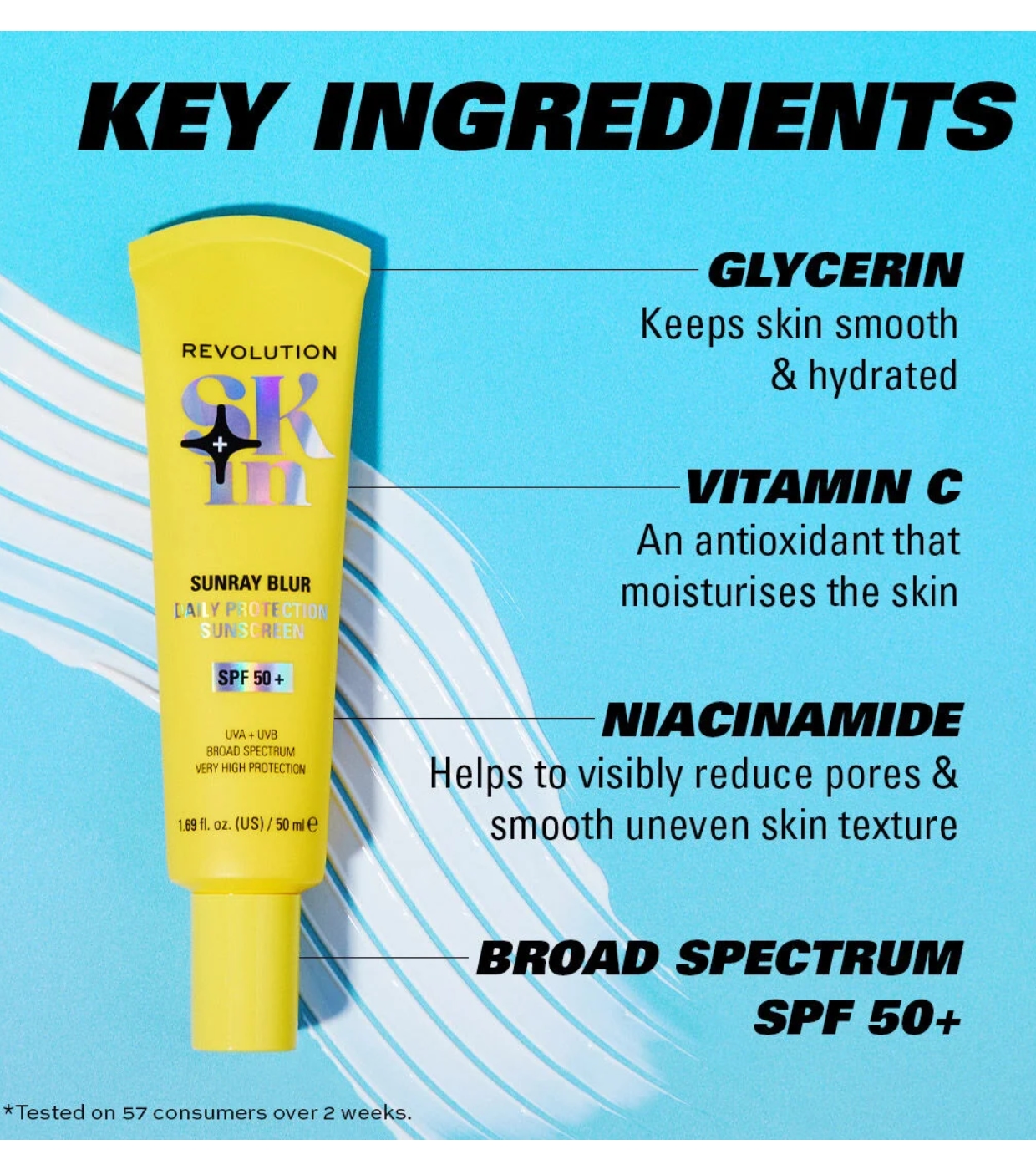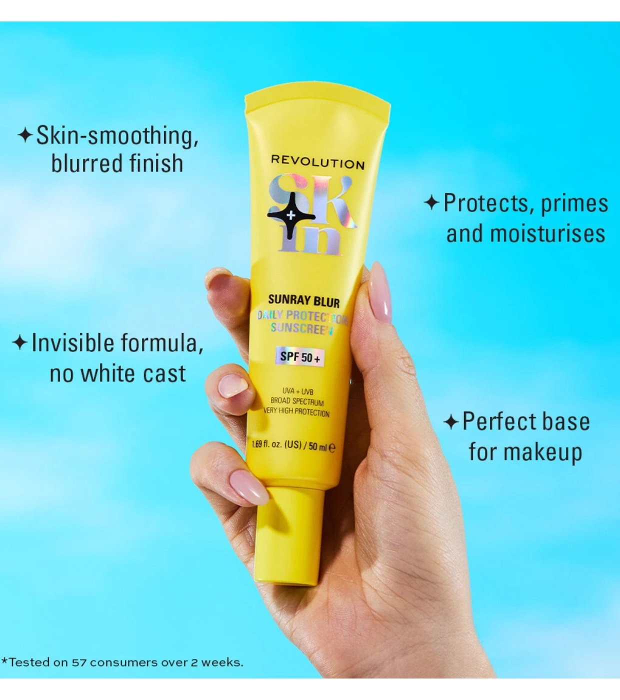 ¡Luce una piel suave, hidratada y protegida con el protector solar matificante Sunray Blur SPF50+ de Revolution!