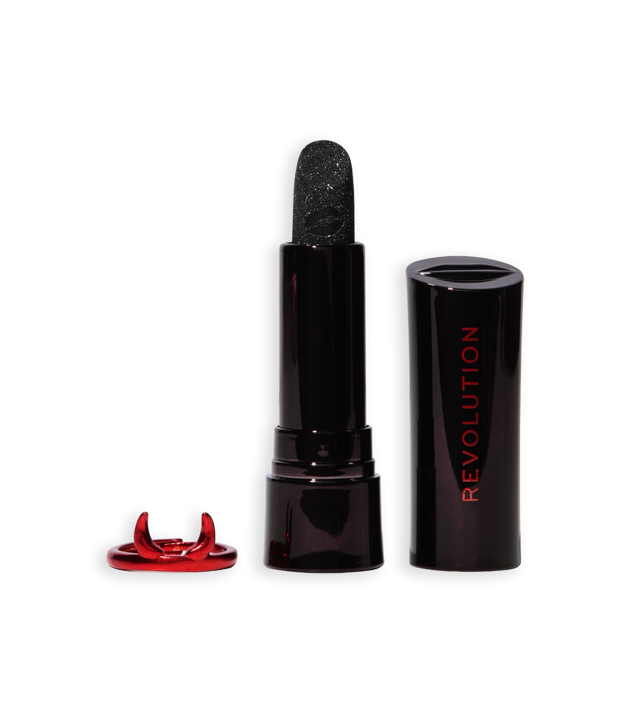 La icónica barra de labios, un éxito rotundo, vuelve con una mejora espeluznante: un intenso tono negro medianoche, cubierto con purpurina brillante que esconde un giro maléfico... ¡un anillo ajustable rojo con cuernos!