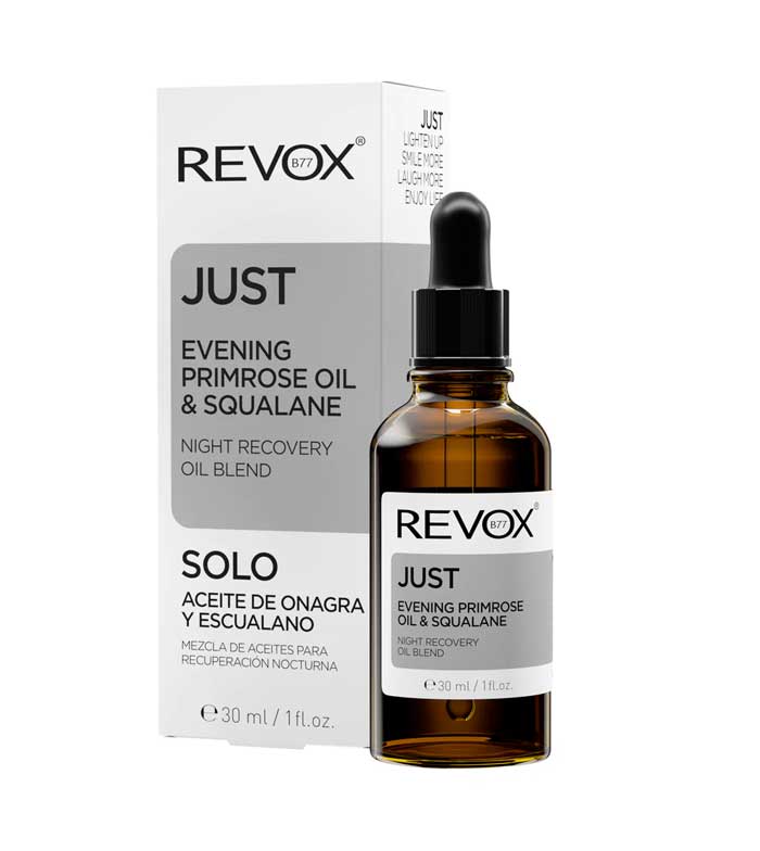 El aceite de Onagra y Escualano Just de Revox es un suero nutritivo para rostro y el cuello.
