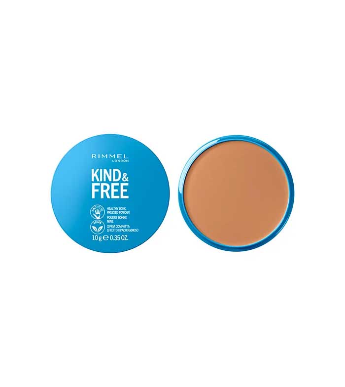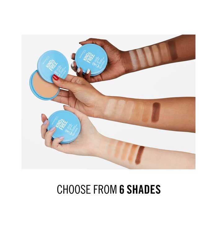 Polvos compactos Kind & Free™ de Rimmel London efecto matificante y textura ligera.