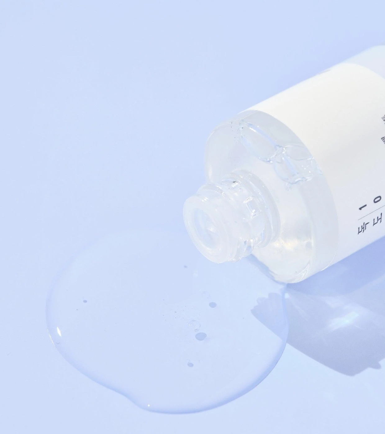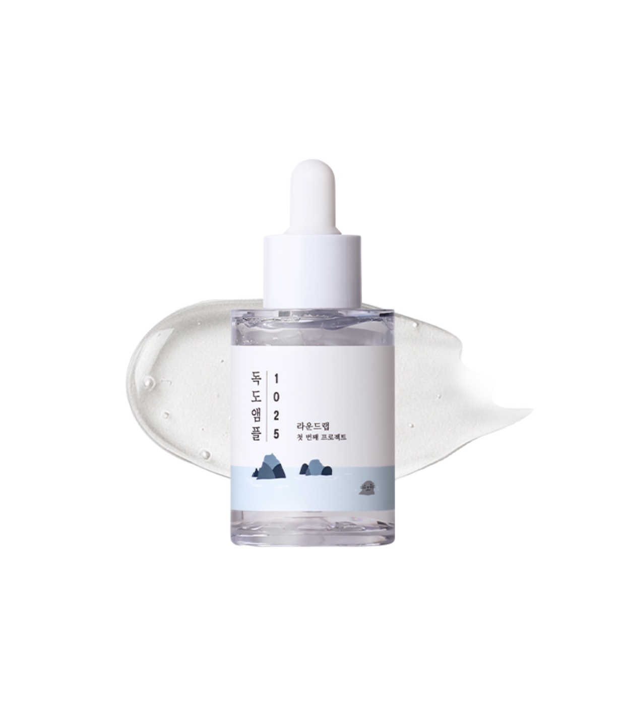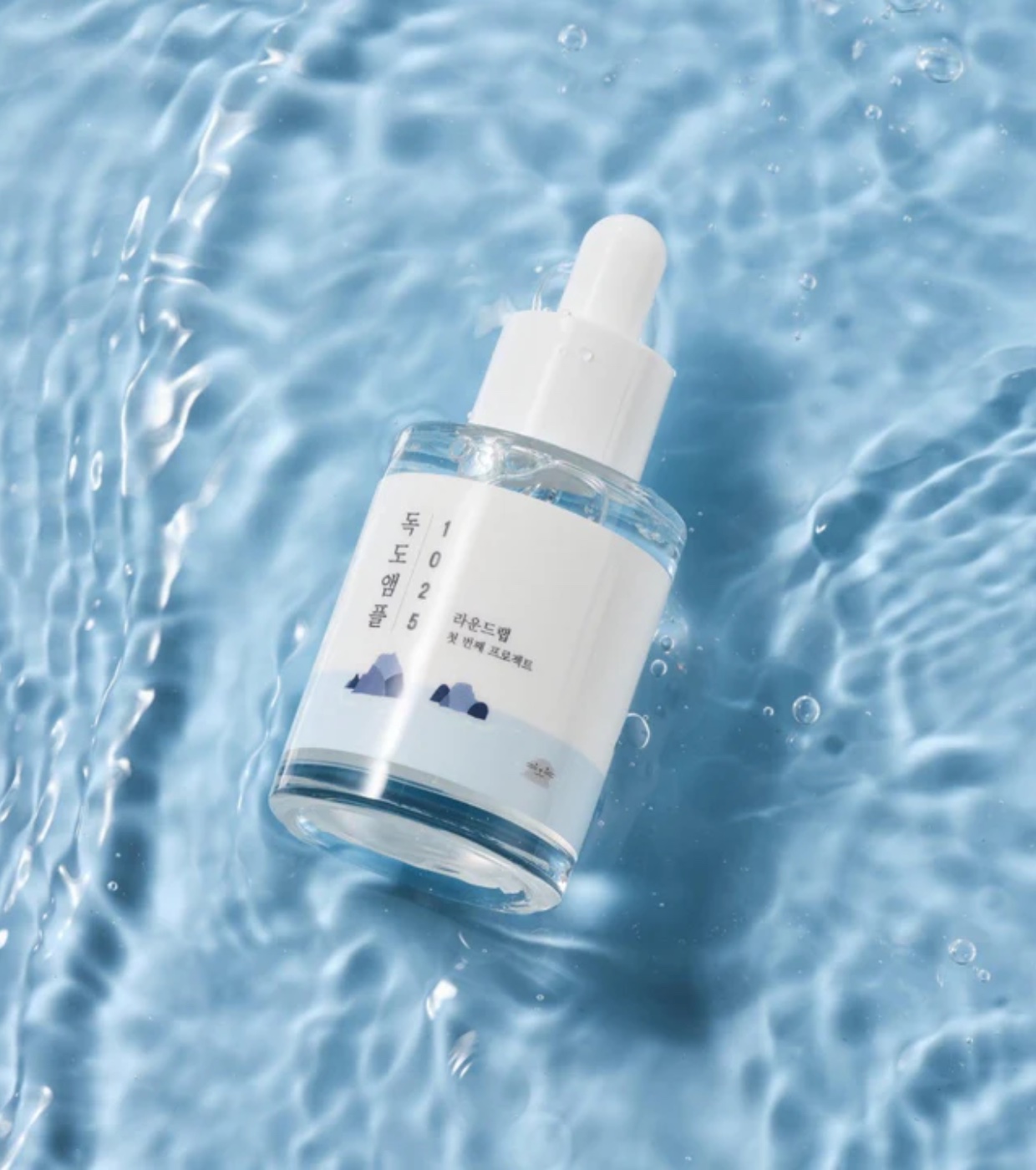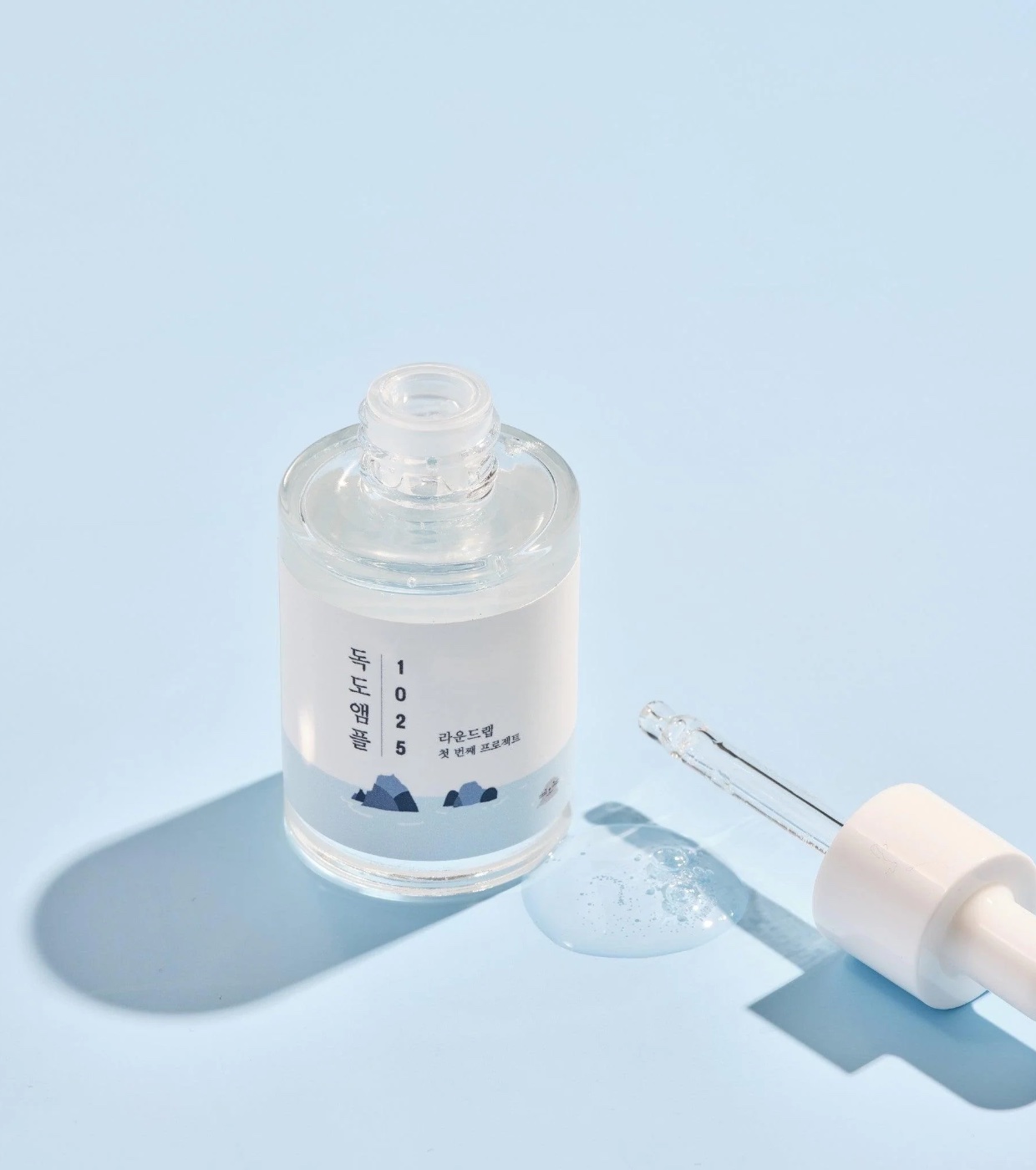 La ampolla hidratante 1025 Dokdo de Round Lab de textura acuosa, calma al instante e hidrata eficazmente.