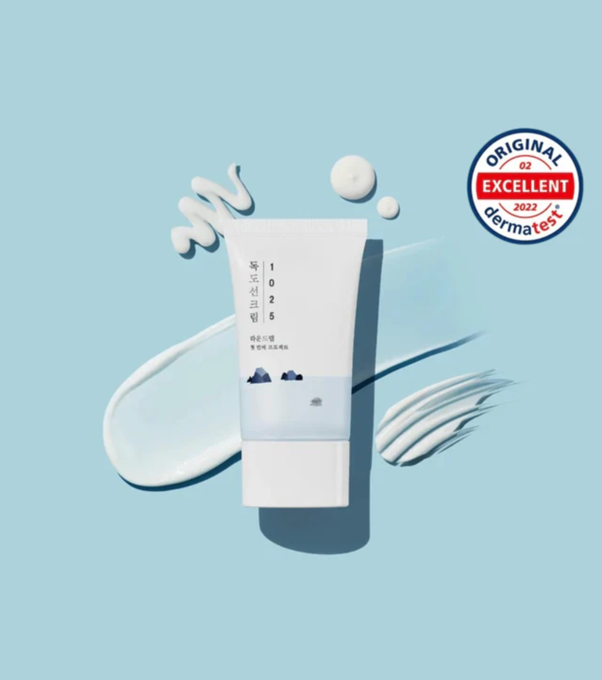 Protector solar 1025 Dokdo SPF 50+ PA++++ de Round Lab, este protector solar químico mantiene la piel protegida contra los rayos UV mientras repone la humedad gracias al agua de mar profunda rica en minerales y tres tipos de ácido hialurónico en los ingredientes.