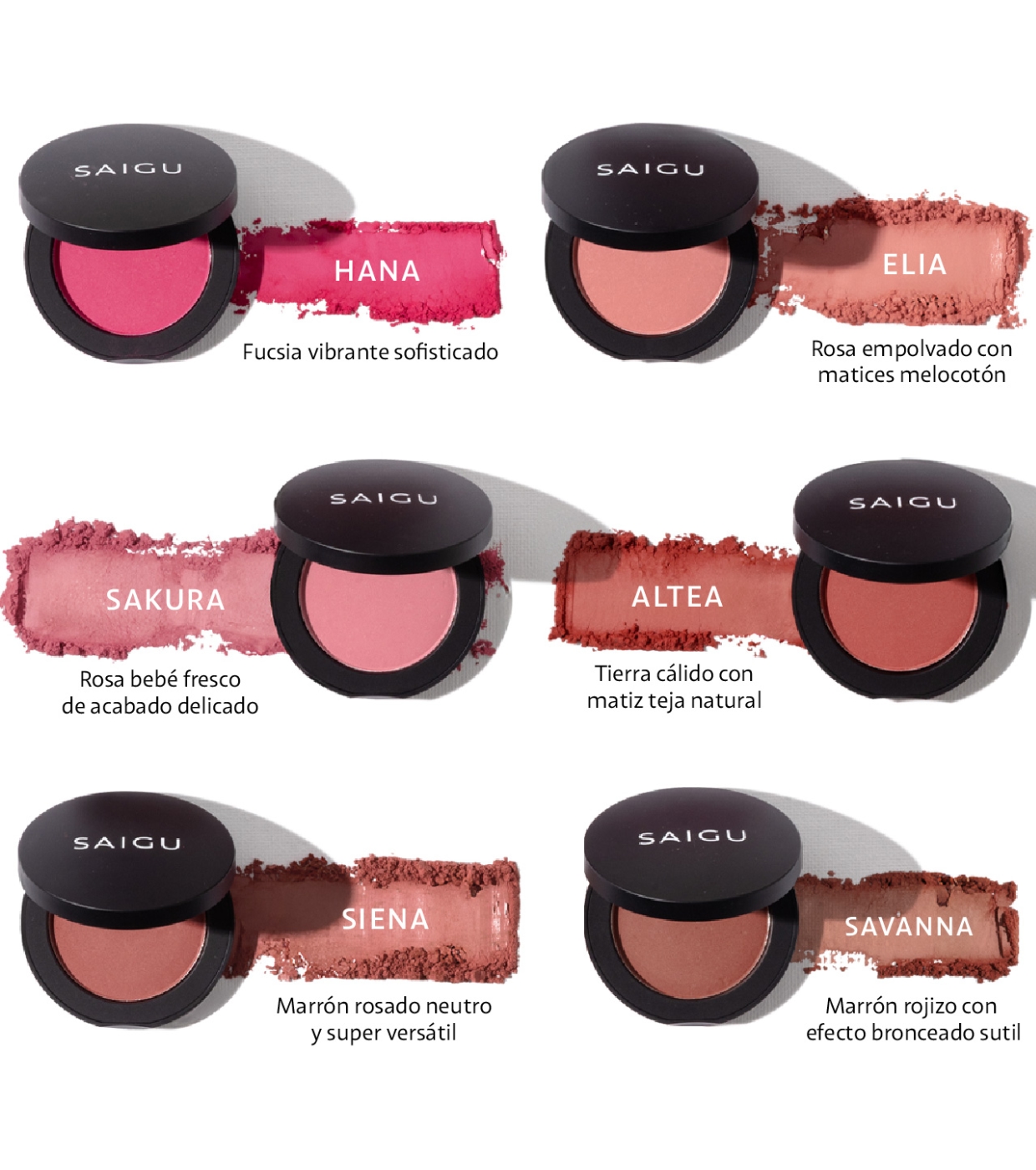 El colorete en polvo de Saigu Cosmetics ofrece una experiencia de aplicación suave y sedosa, proporcionando una textura ligera que se integra fácilmente con la piel.