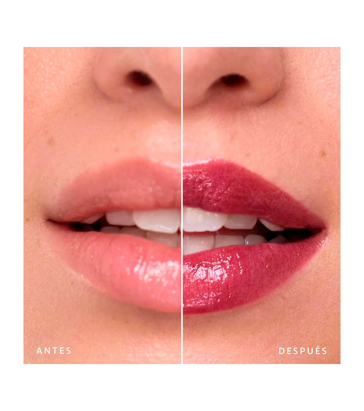 Enriquecido con aceite de jojoba, manteca de karité y ácido hialurónico en diferentes pesos moleculares, este pintalabios ofrece hidratación profunda y duradera.