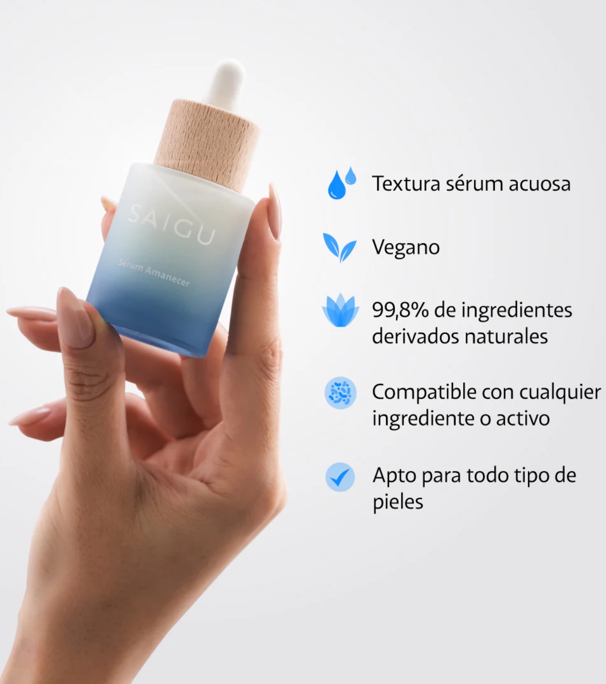 El sérum Amanecer de Saigu es un sérum antiestrés y revitalizador formulado con Ácido Hialurónico y activos de alta cosmética.