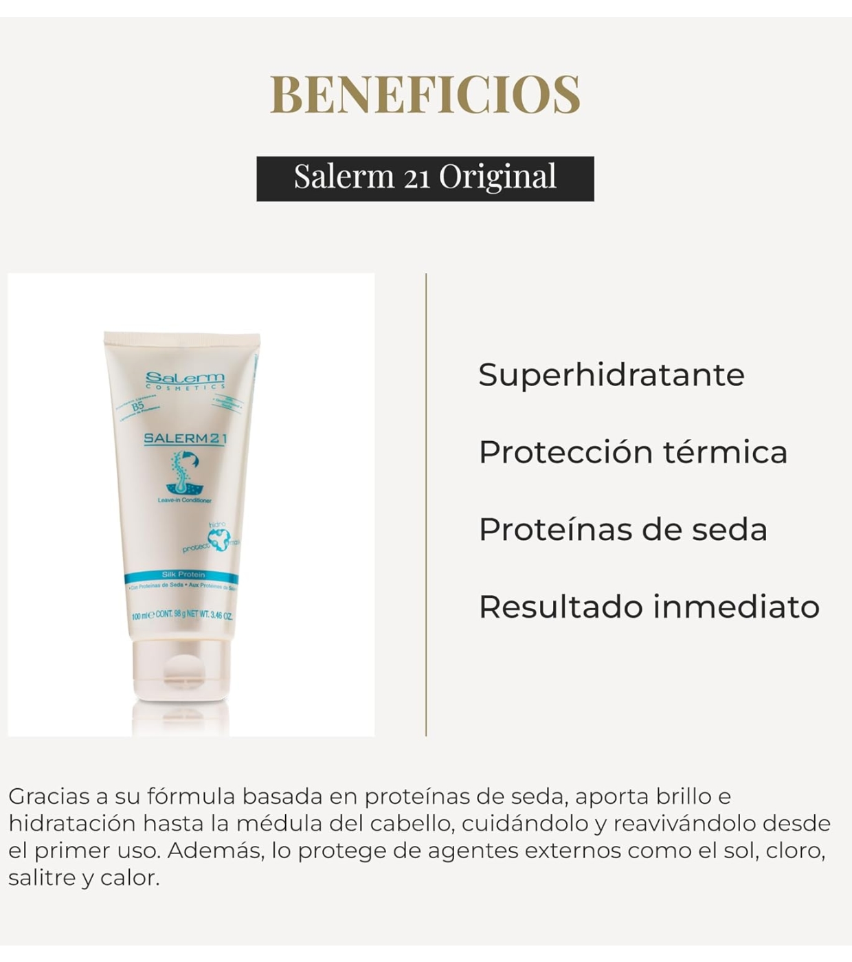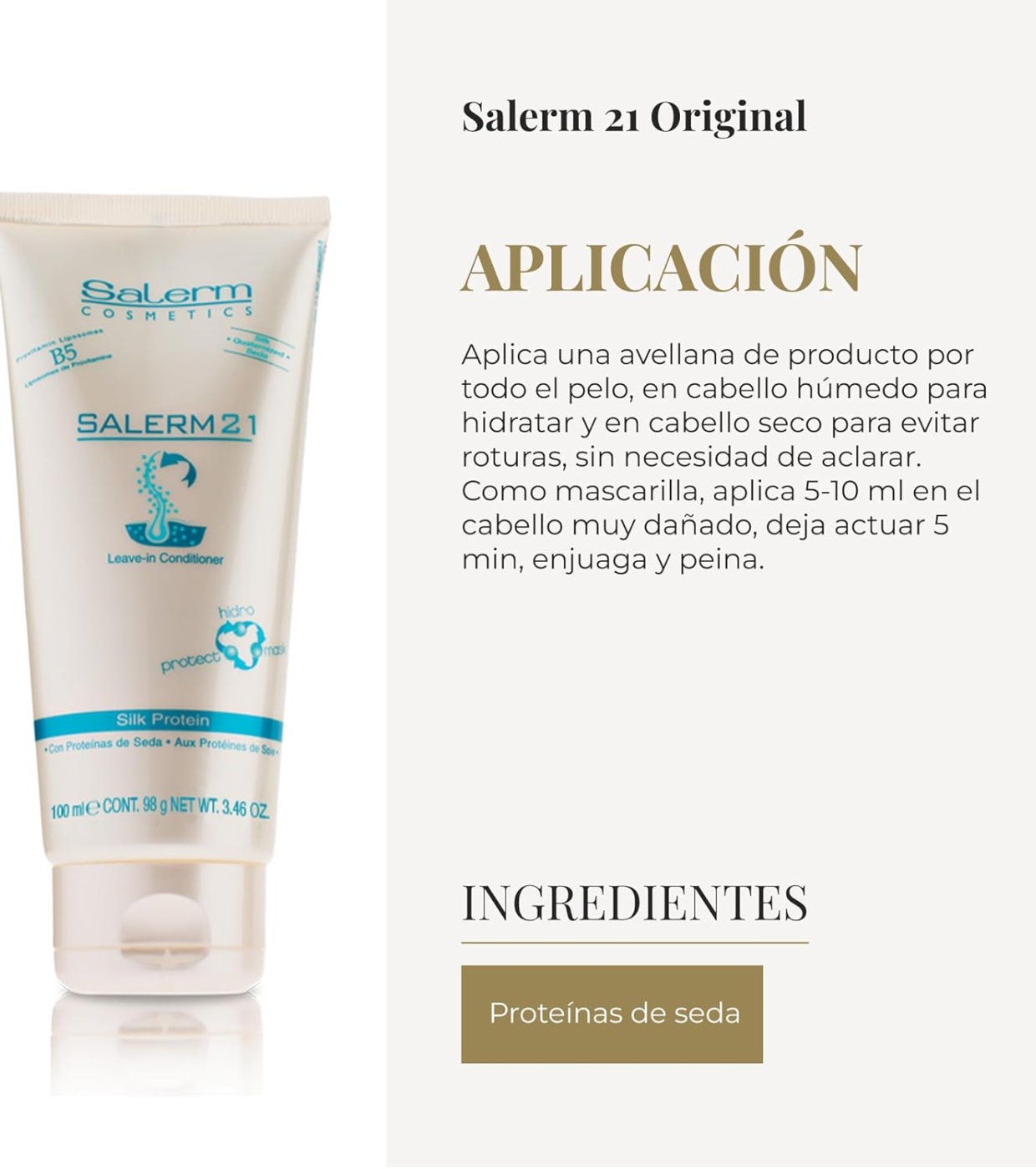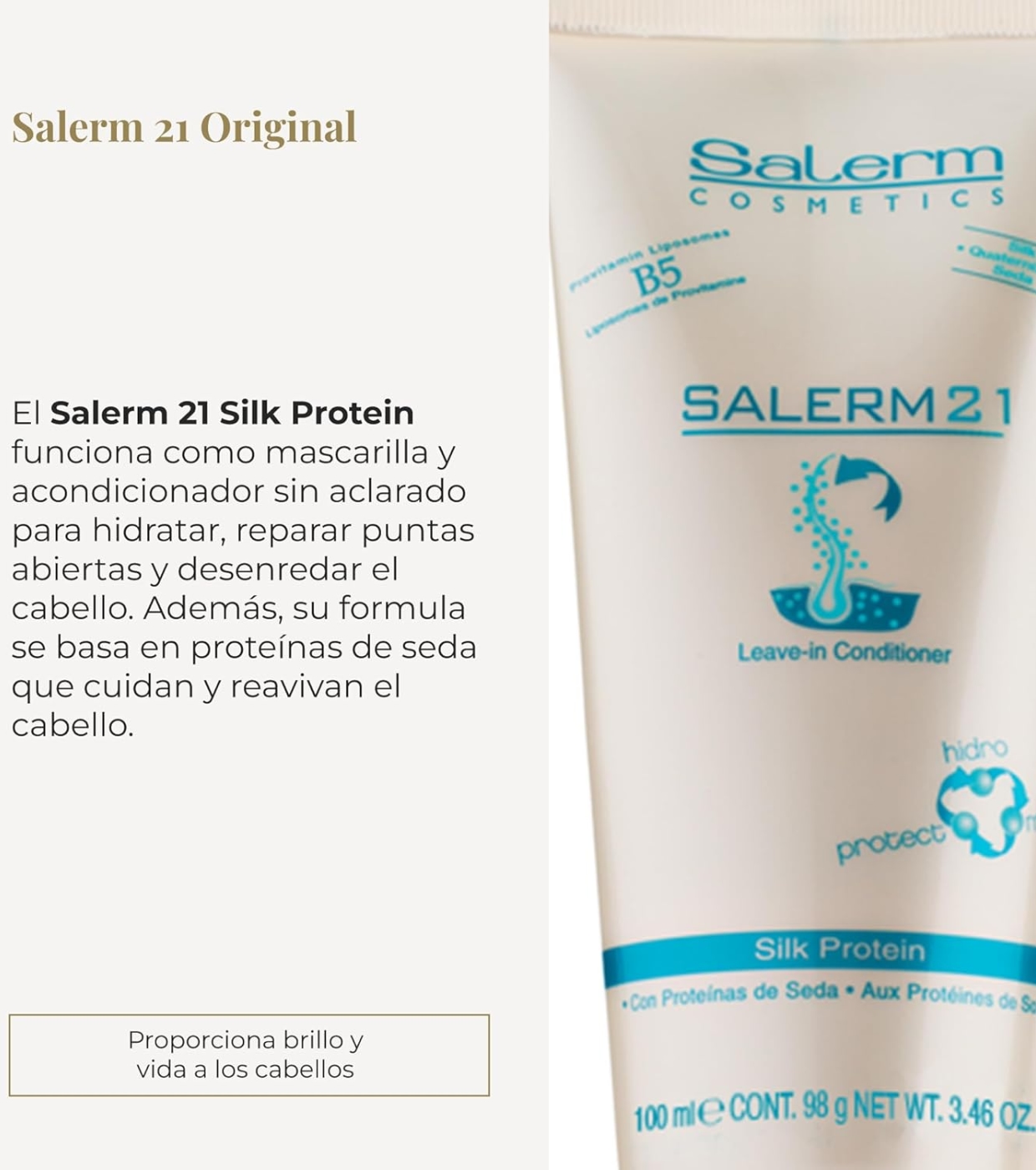 El Salerm 21 Silk Protein Leave-in Conditioner de Salerm es un acondicionador y mascarilla sin aclarado que ofrece una solución completa para el cabello seco, dañado o deshidratado.