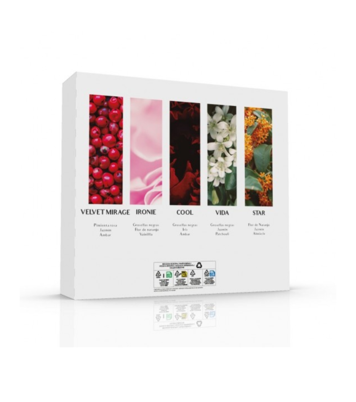 Incluye cinco perfumes en formato de 30 ml, ideales para explorar diferentes perfiles olfativos de forma práctica y organizada.