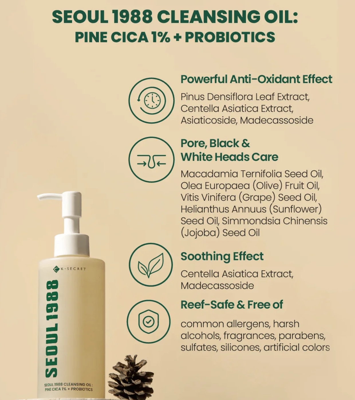 El K-SECRET SEOUL 1988 Cleansing Oil es un aceite limpiador suave pero altamente eficaz, diseñado para eliminar maquillaje, protector solar, exceso de sebo e impurezas sin irritar la piel.