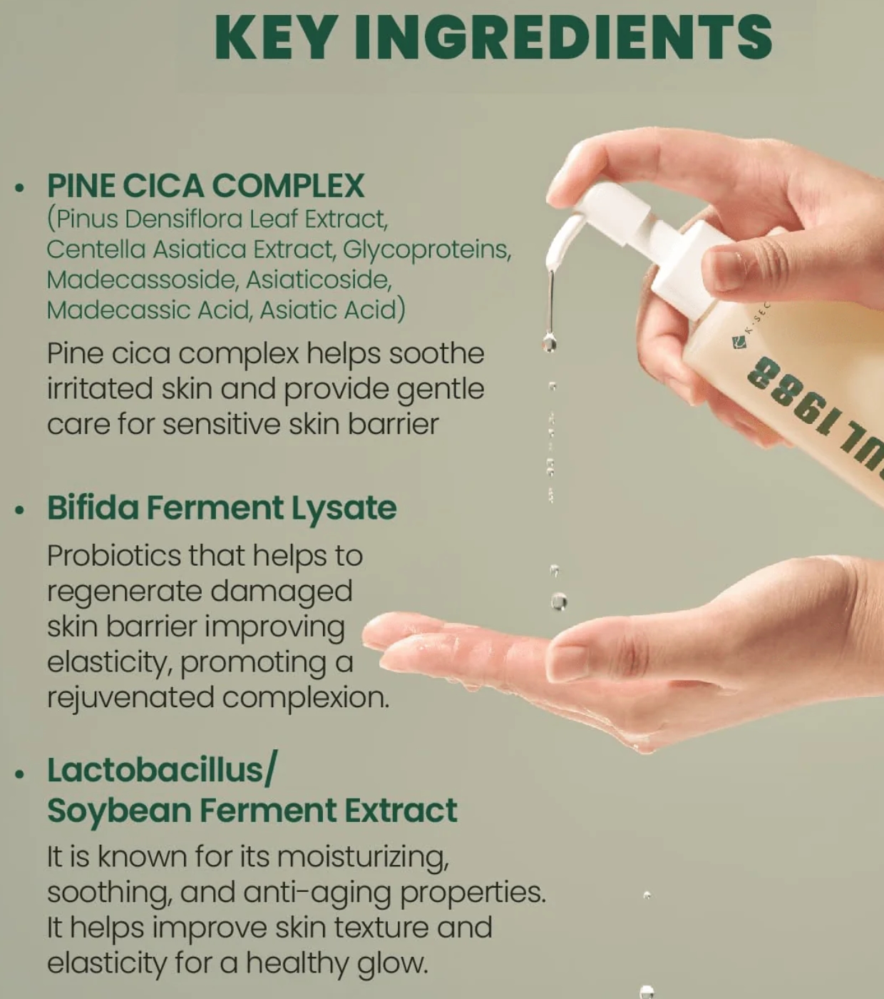 Enriquecido con Pine Cica 1% y probióticos, combina limpieza profunda con un efecto calmante y fortalecedor de la barrera cutánea, convirtiéndose en un aliado ideal para pieles sensibles, reactivas o con tendencia al acné.