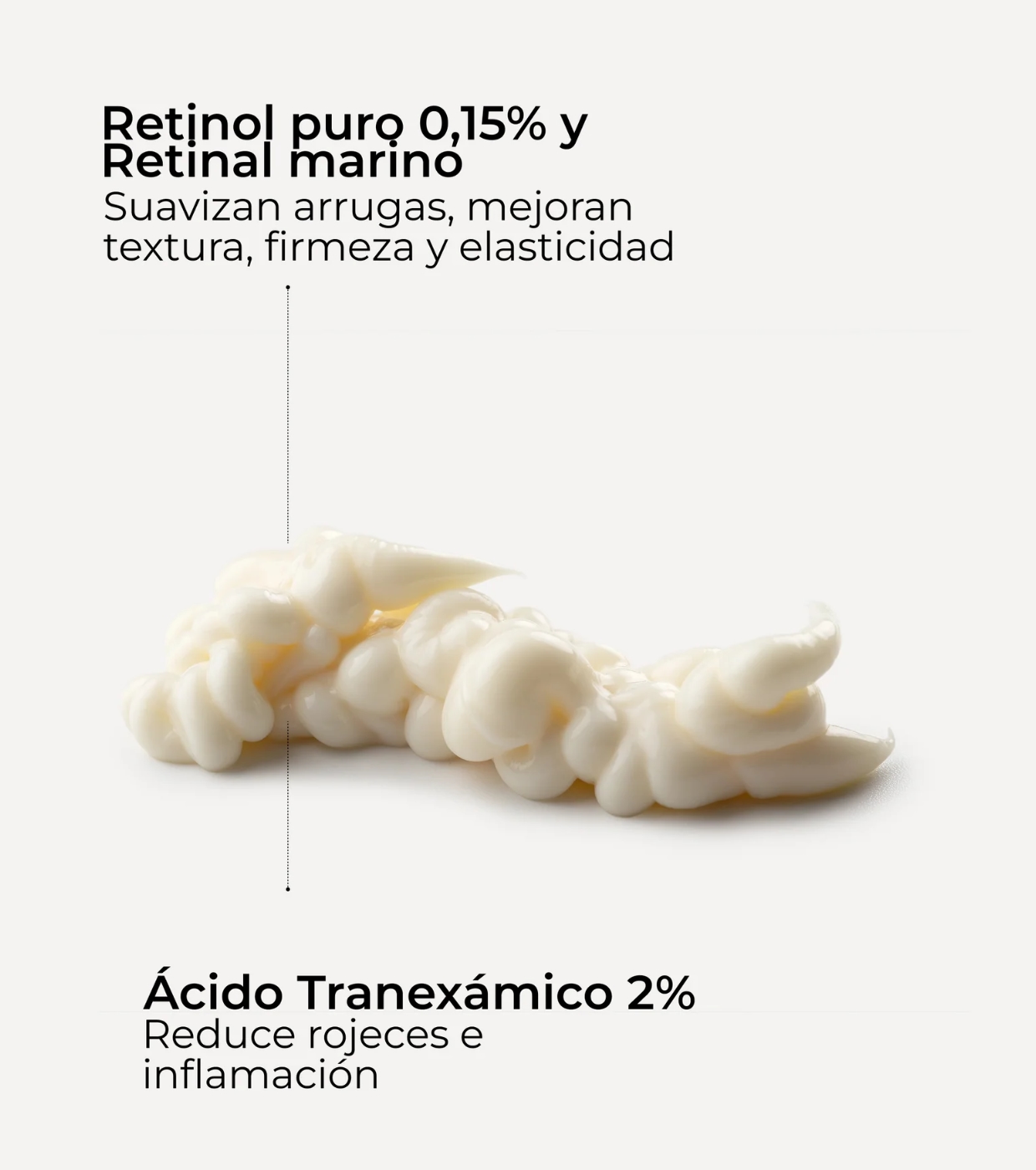 - 1 x PURE RETINOL CONTORNO DE OJOS (15 ml): Contorno de noche con retinol puro liposomado 0,15% y retinal marino 1%; Con ácido tranexámico, cafeína, extractos descongestivos, ceramidas y vitamina E; Trata arrugas, bolsas, ojeras vasculares y pigmentarias. Alta tolerancia.