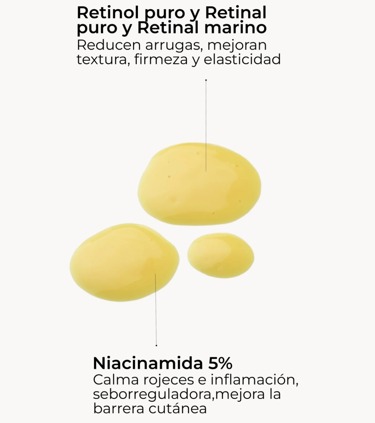 - 1 x TRIPLE RETINOID SÉRUM (30 ml): Sérum de noche con retinol puro 0,3%, retinal puro 0,15% y retinal marino 1%; Con niacinamida al 5%, centella asiática, regaliz y vitamina E; Acción antiedad intensiva: arrugas, poros, firmeza, textura y tono.