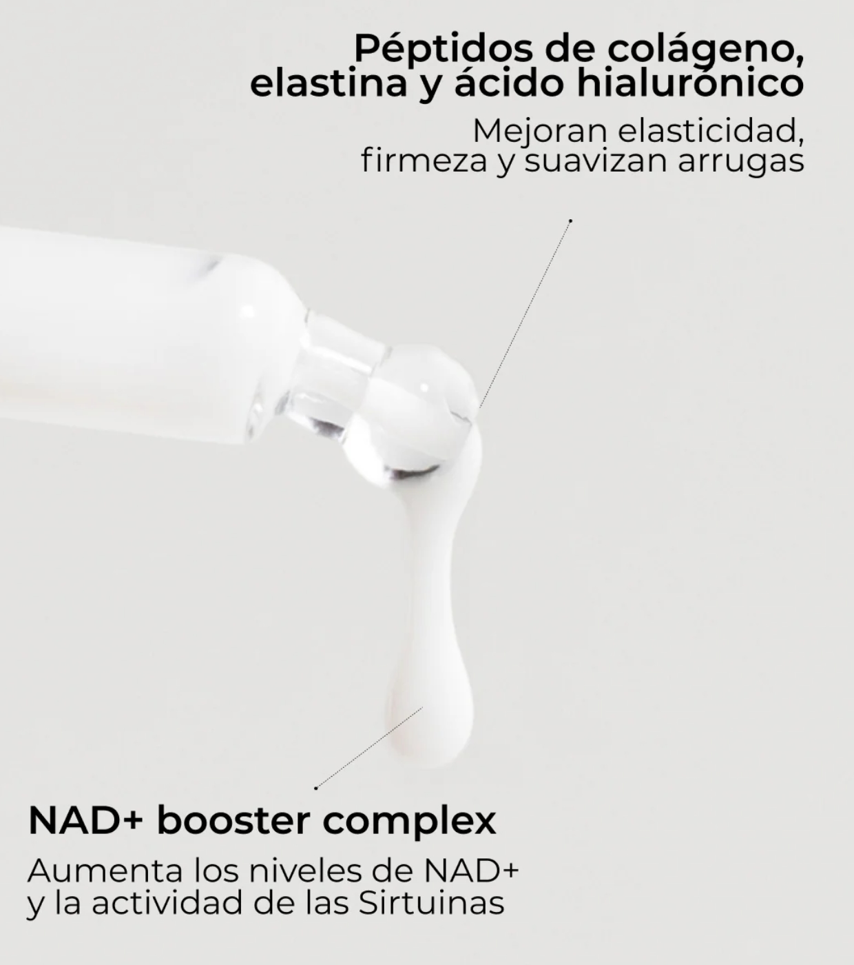 Su acción va más allá de un simple efecto reafirmante: trabaja sobre los mecanismos internos responsables del envejecimiento visible, ayudando a mantener la piel más firme, elástica y luminosa a largo plazo.