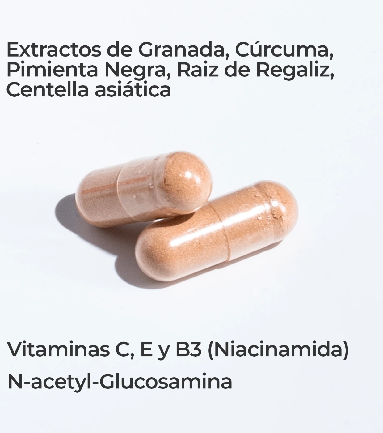 POMANOX® P30 [EXTRACTO SECO DE FRUTO DE GRANADA (PUNICA GRANATUM L.) 30% PUNICALAGINAS Y 8% ÁCIDO ELÁGICO], CÁPSULA [AGENTE DE RECUBRIMIENTO (HIDROXIPROPILMETILCELULOSA)],N-ACETIL-D-GLUCOSAMINA,CURCUMIN C3 REDUCT® (TETRAHIDROCURCUMINOIDES), EXTRACTO SECO DE RAÍZ DE REGALIZ (GLYCYRRHIZA GLABRA L.) 20% GLICIRRICINA, EXTRACTO SECO DE PARTES AÉREAS DE GOTUKOLA (CENTELLA ASIÁTICA (L.) URB.) 3% ASIATICÓSIDOS, VITAMINA C (ÁCIDO L-ASCÓRBICO), AGENTE DE CARGA (CELULOSA MICROCRISTALINA), NIACINA (NICOTINAMIDA), ANTIAGLOMERANTE (SALES MAGNÉSICAS DE ÁCIDOS GRASOS, DIÓXIDO DE SILICIO), EXTRACTO SECO DE FRUTO DE PIMIENTA NEGRA (PIPER NIGRUM L.) 95% PIPERINA, VITAMINA E (SUCCINADO ÁCIDO DE D-ALFA-TOCOFERILO).