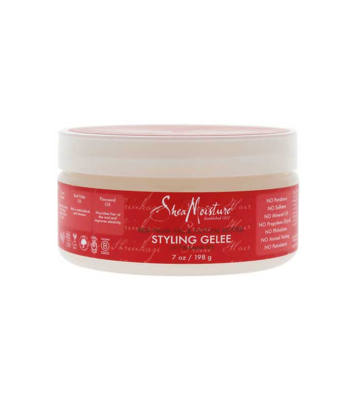 El gel de peinado Styling Gelee de aceite de palma roja y manteca de cacao de Shea Moisture proporciona una fijación ligera y una consistencia acuosa a tucabello para minimizar la contracción del rizo.
