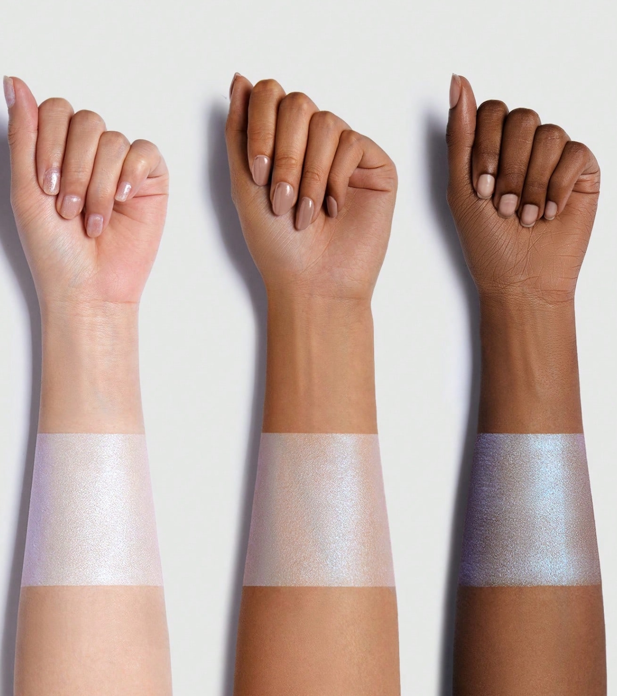 Su brillo reflectante multidimensional capta la luz desde todos los ángulos, aportando un efecto mágico y casi extraterrestre sobre la piel.