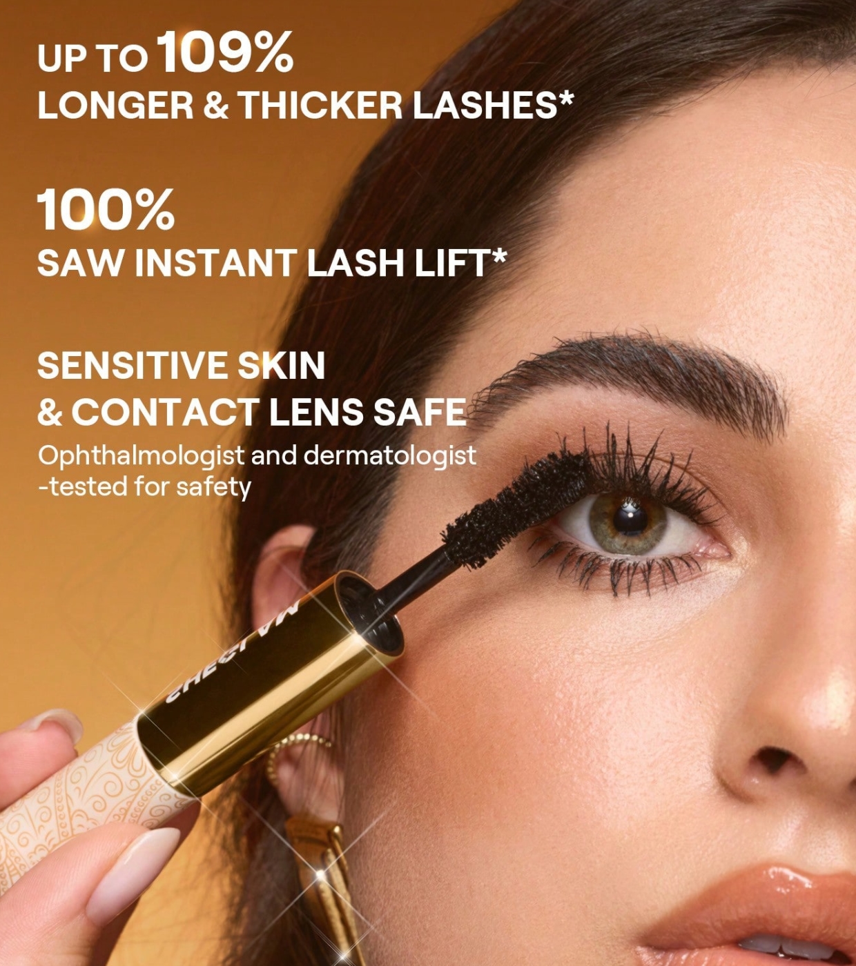 Pestañas con aspecto lujoso, más densas, elevadas y perfectamente definidas. Un acabado impactante que transforma tu mirada con un toque de glamour dorado.