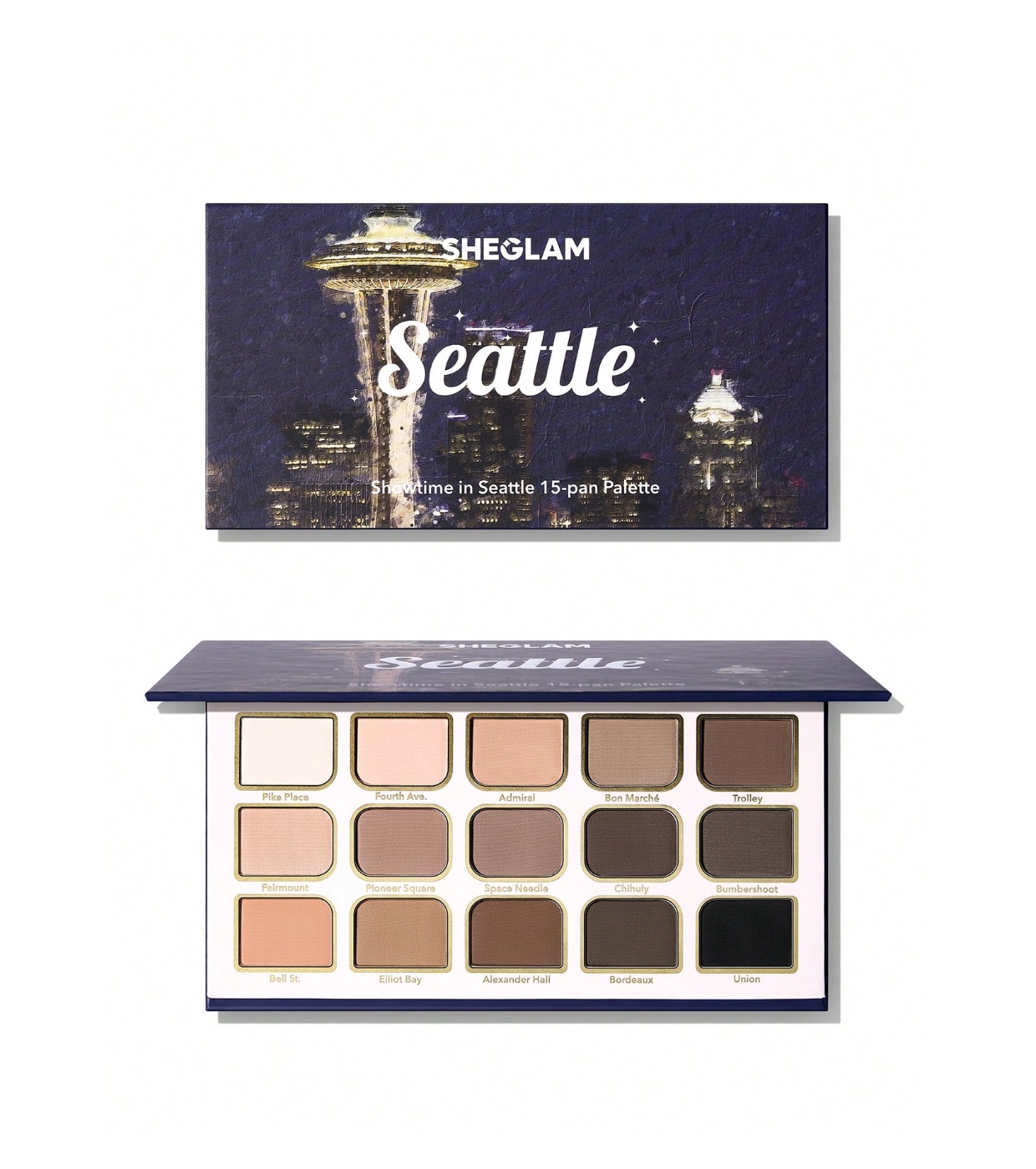 Entra en escena con la paleta de sombras Showtime in Seattle de SHEGLAM, una paleta compuesta por 15 tonos totalmente mate inspirados en la energía y elegancia de la ciudad.