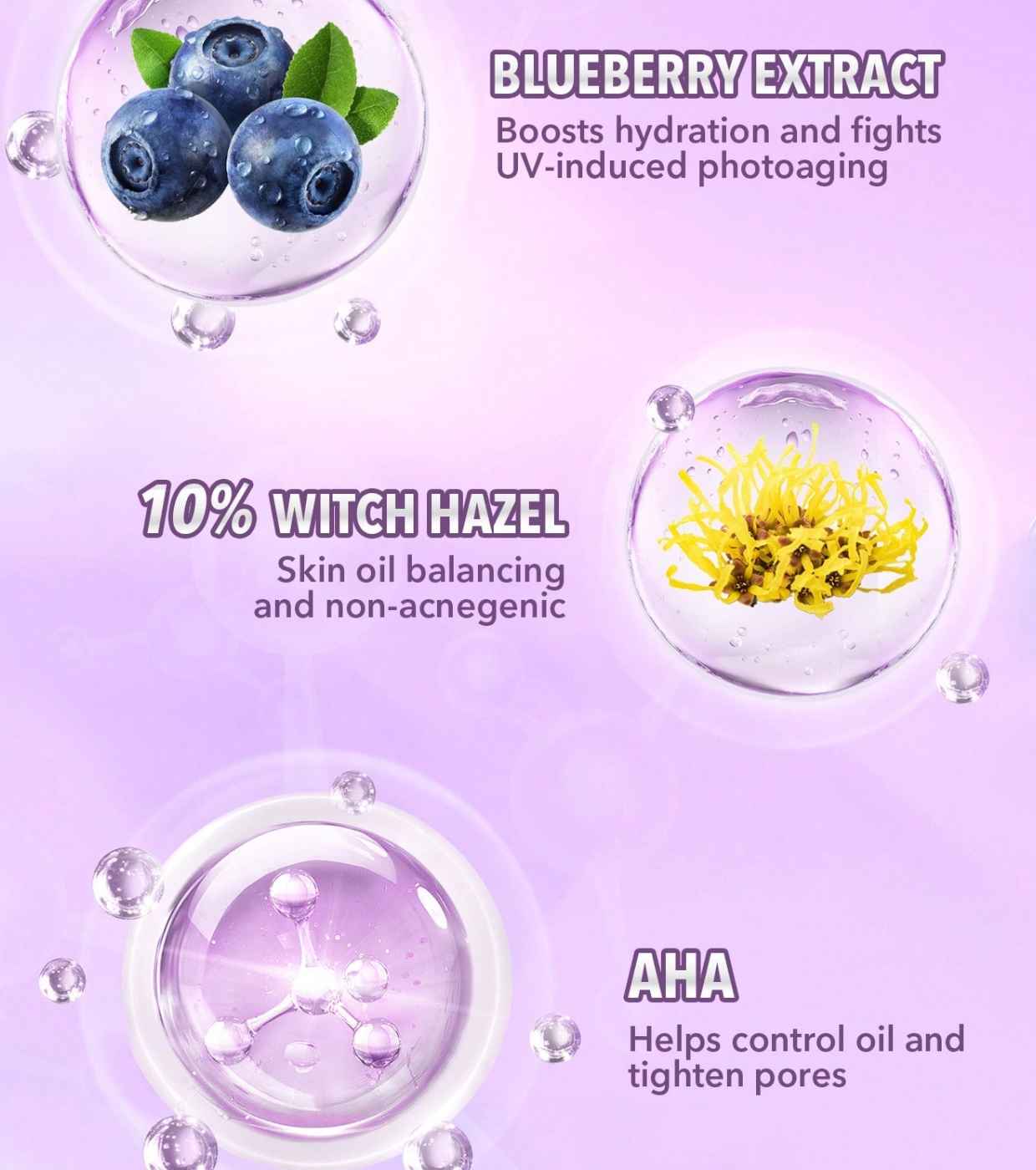 WATER/AQUA/EAU, HAMAMELIS VIRGINIANA (WITCH HAZEL) FLOWER WATER, ALCOHOL, GLYCERIN, METHYL GLUCETH-20, PEG-150 DISTEARATE, PULLULAN, PVP, 1,2-HEXANEDIOL, HYDROXYACETOPHENONE, VACCINIUM ANGUSTIFOLIUM (BLUEBERRY) FRUIT EXTRACT, POLYACRYLATE CROSSPOLYMER-6, ARGININE, CARBOMER, BUTYLENE GLYCOL, FLAVOR/AROMA, GLYCINE SOJA (SOYBEAN) SEED EXTRACT, MENTHOL, FRAGRANCE/PARFUM, INOSITOL, PANTHENOL, CAPRYLHYDROXAMIC ACID, SODIUM HYALURONATE, PROPANEDIOL, SODIUM LACTATE, GLYCOLIC ACID, SUCROSE, SODIUM CITRATE, UREA, TARTARIC ACID, MALIC ACID, RED 33/CI 17200, BLUE 1/CI 42090.