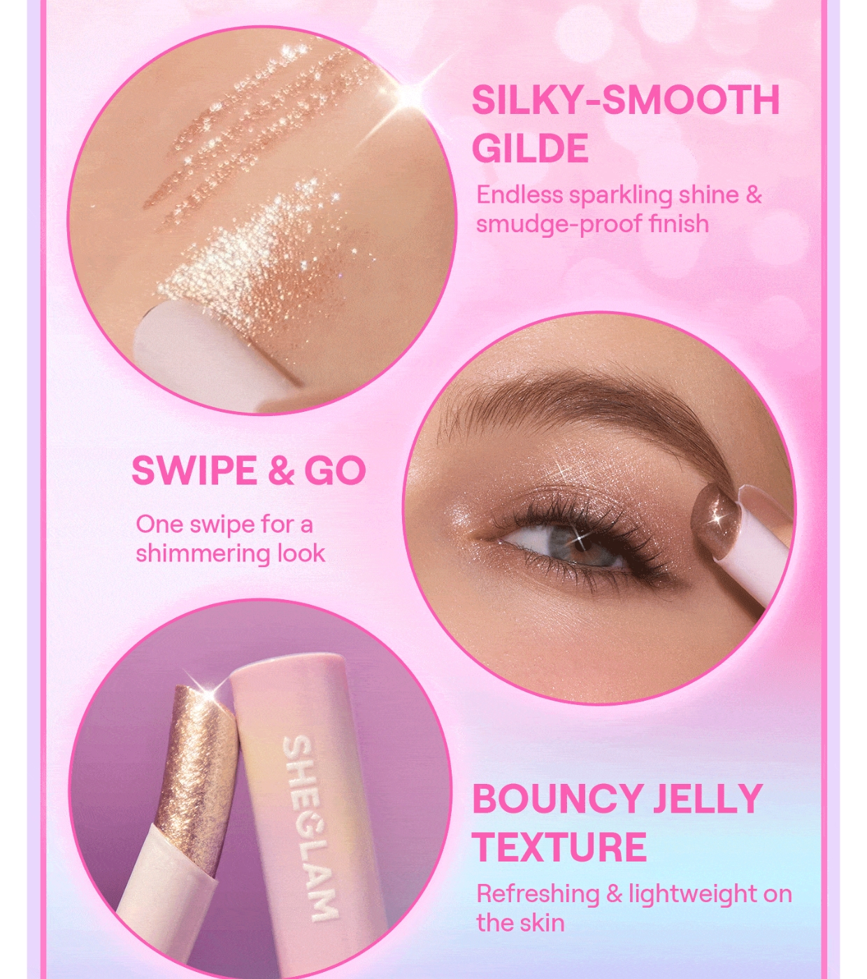 Sube la temperatura y deslumbra con la sombra de ojos Crystal Jelly de SHEGLAM, un iluminador en stick que combina agua y perlas de brillo para crear un acabado húmedo, ligero y ultra luminoso en una sola pasada.