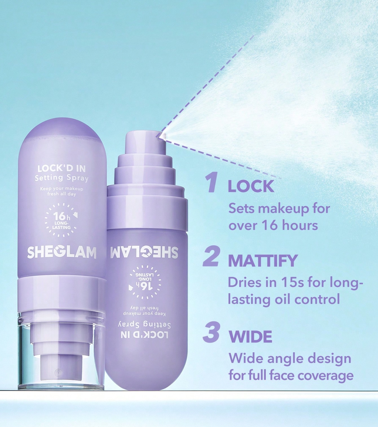 Mantén tu piel mate todo el día con el Spray Fijador Lock'd de SHEGLAM de larga duración, diseñado para fijar el maquillaje mientras controla el exceso de brillo.