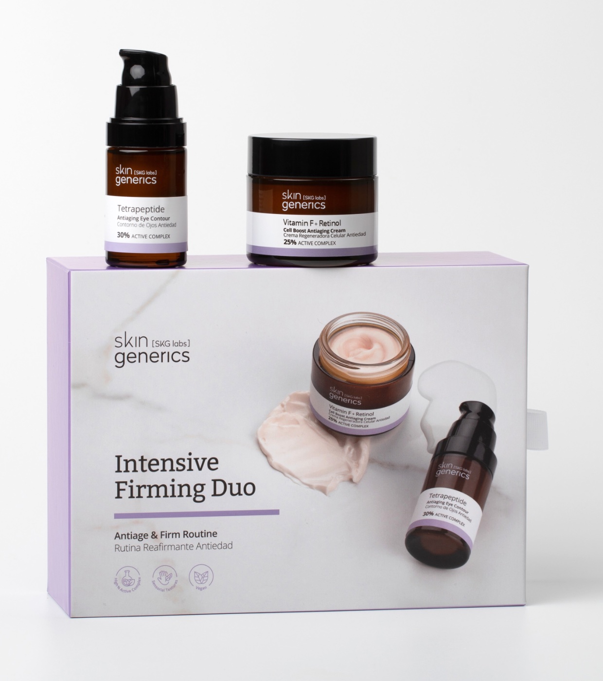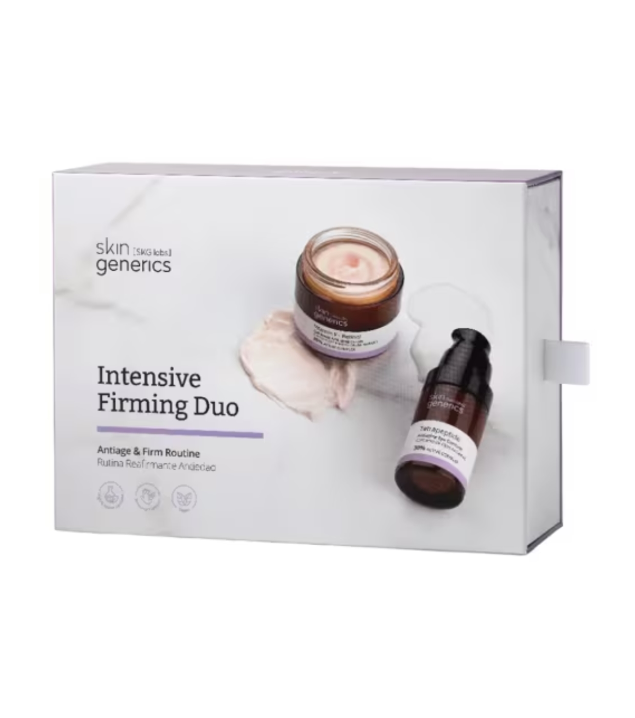 Este dúo reafirmante intensivo de Skin Generics reafirma tu rostro con un alto % de complejos activos.