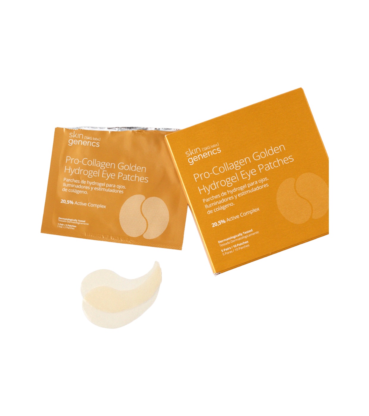 Descubre los parches de hidrogel Pro-Collagen Golden de Skin Generics, la solución perfecta para reducir la apariencia de las bolsas y ojeras con nuestros parches impregnados en un cocktail de activos pro-colágeno e iluminadores.