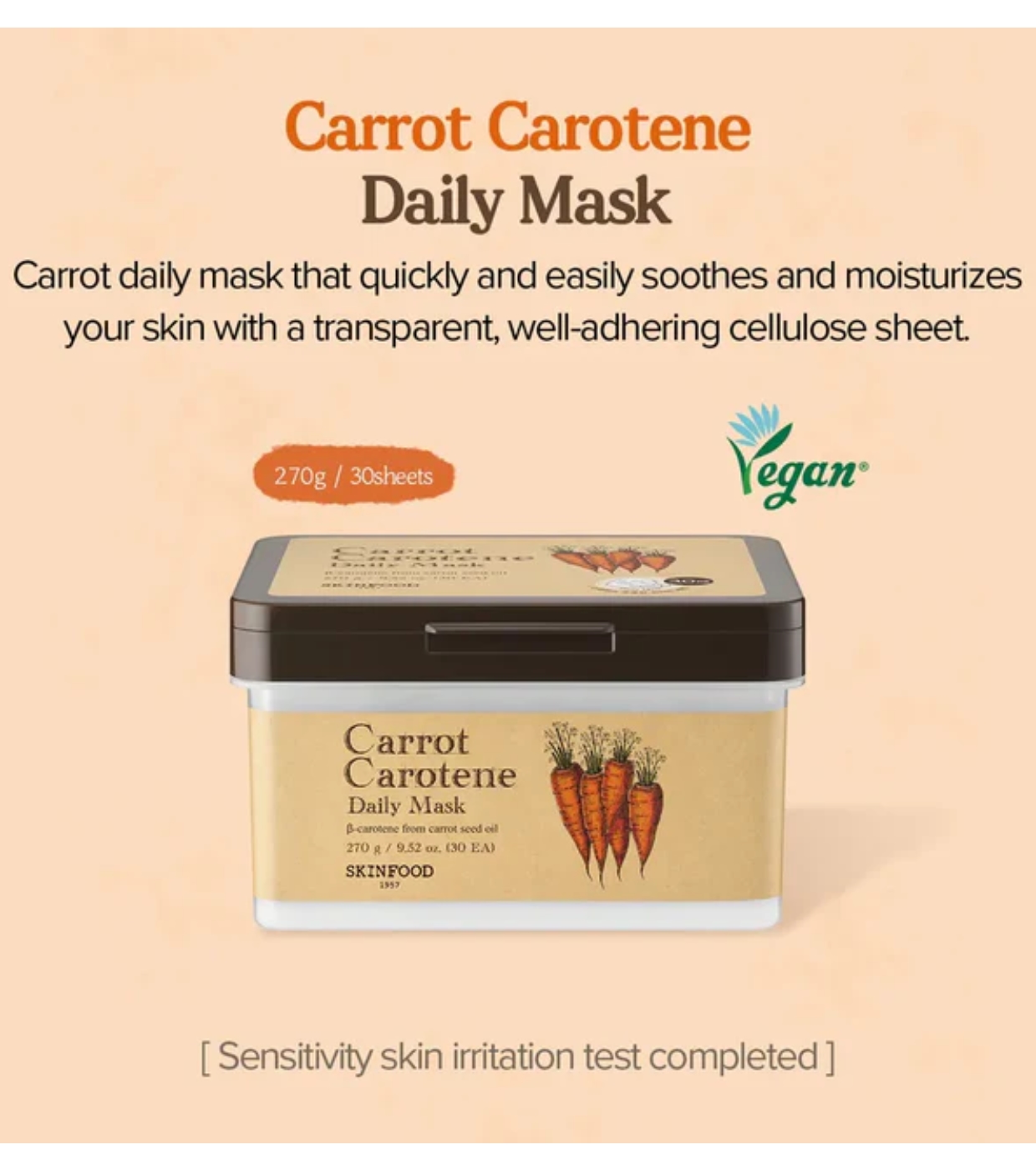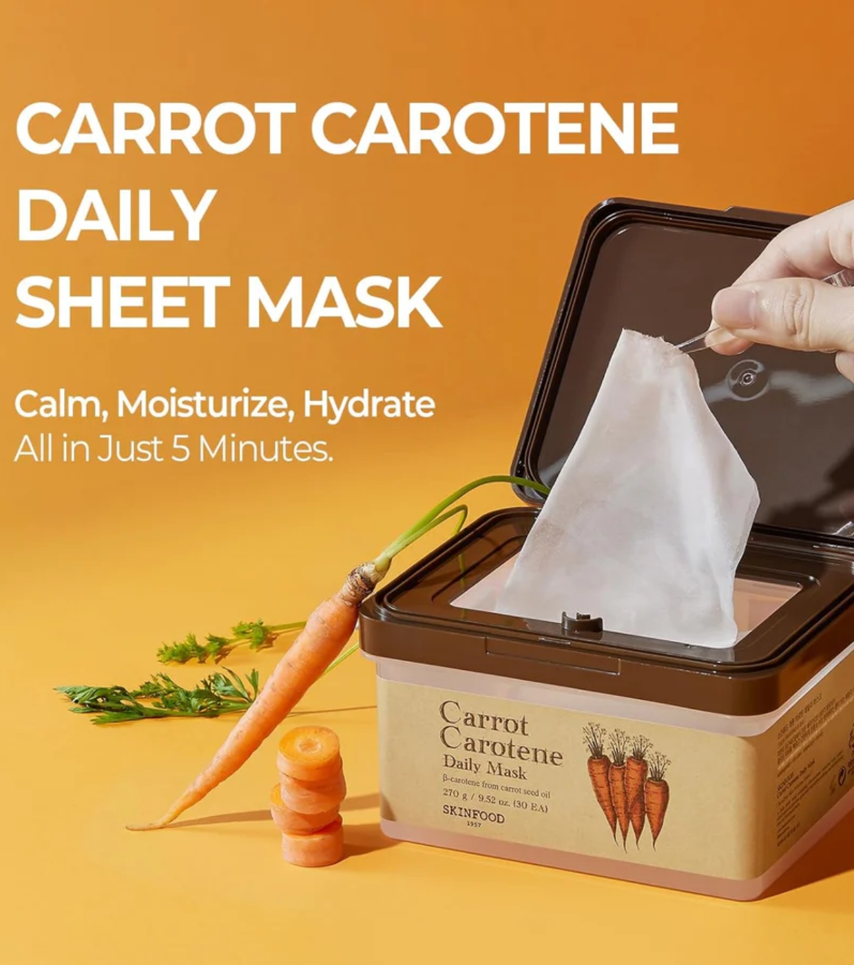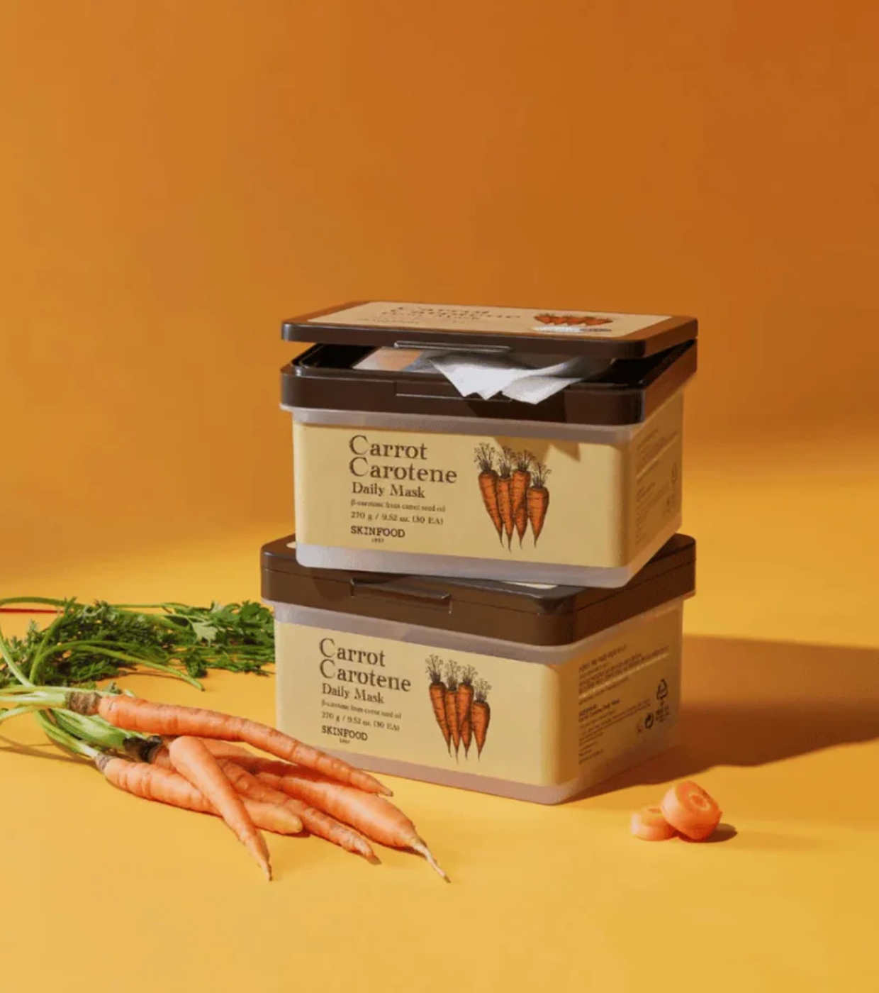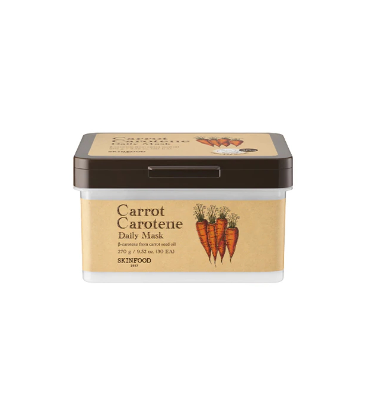 La mascarilla diaria Carrot Carotene de Skinfood está formulada con extracto de zanahoria orgánica rica en betacarotenos (caroteno) y antioxidantes naturales que ayudan a calmar, hidratar y revitalizar la piel estresada y apagada.