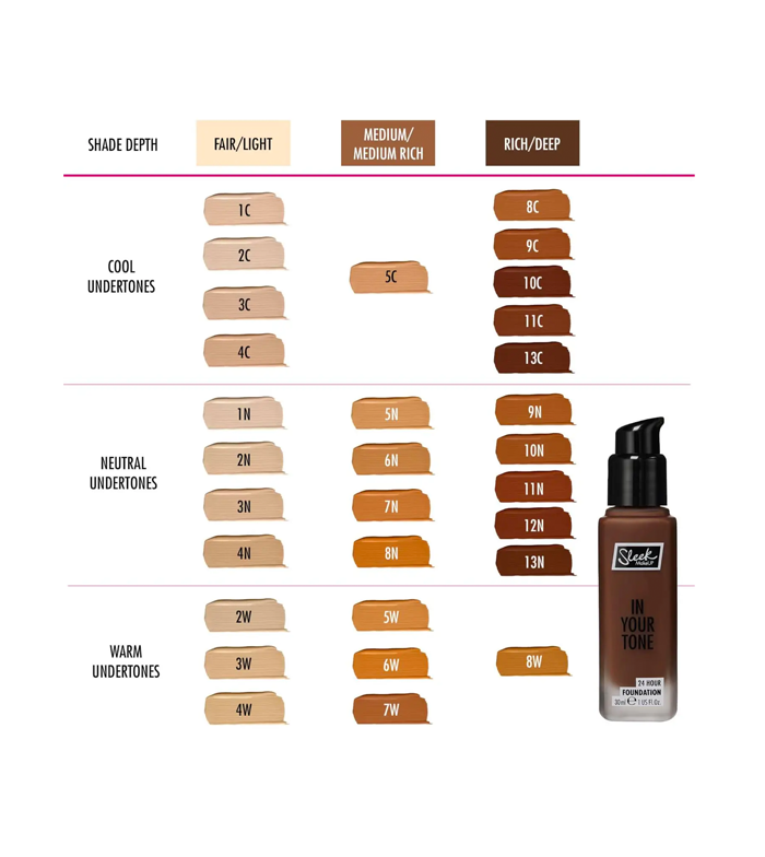 Base de maquillaje In Your Tone 24 Hour de Sleek, con cobertura semimate modulable y apta para todo tipo de pieles.