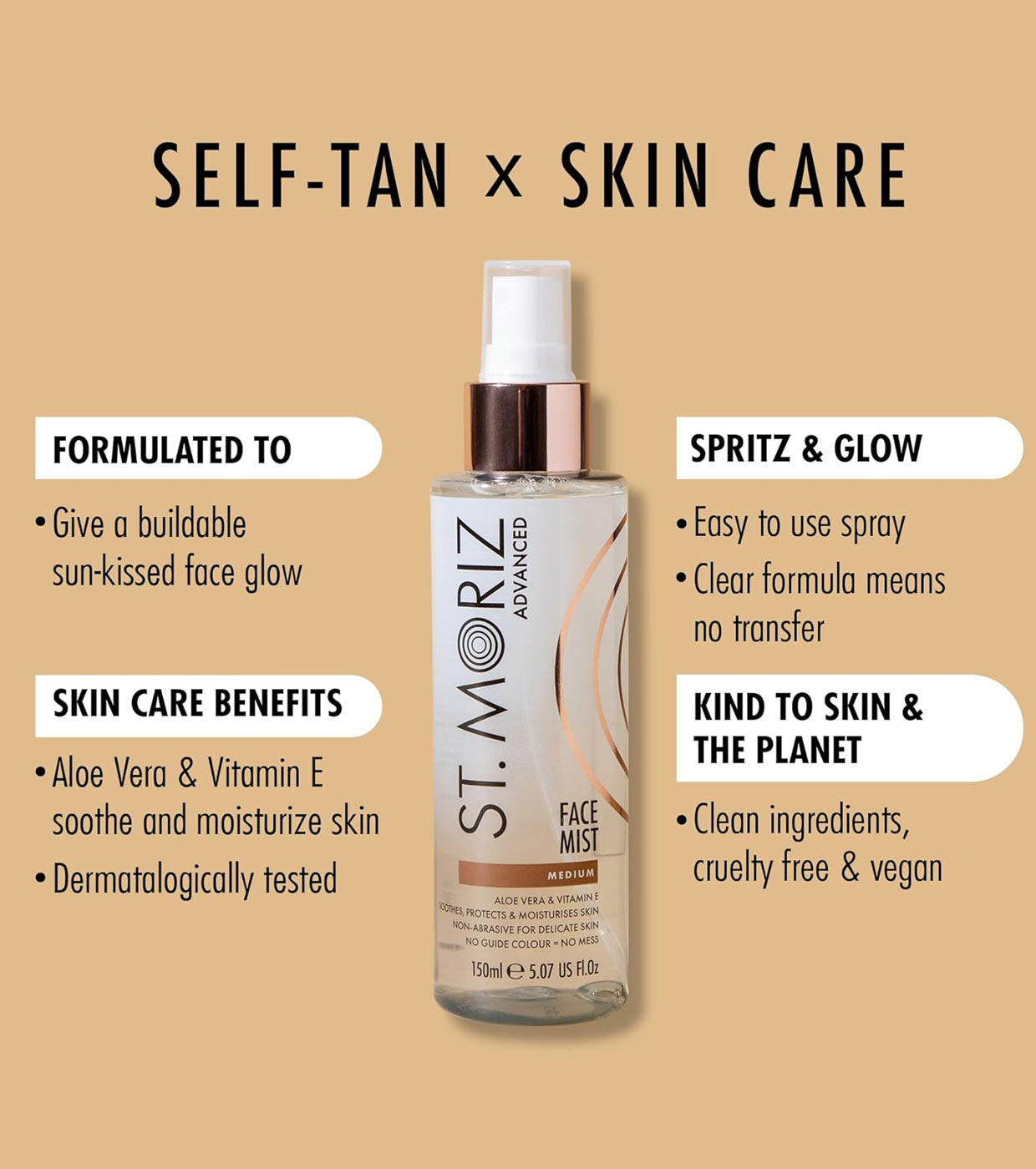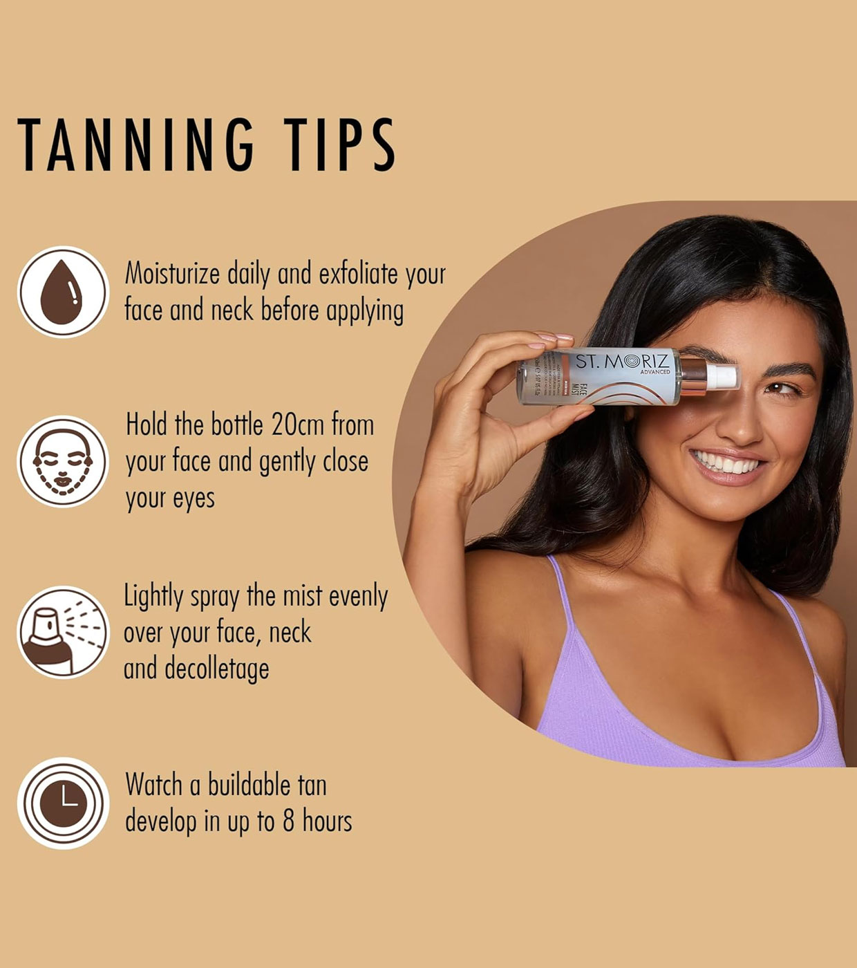 St Moriz Advanced Face Tanning Mist es una bruma bronceadora suave que se puede utilizar a diario para conseguir el resplandor perfecto, es decir, ¡cuanto más se aplique, más resplandecerá!