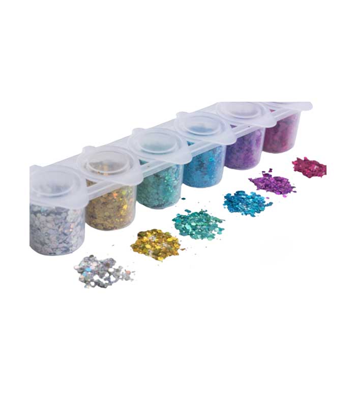 Son glitters hechos de 100% de tereftalato de polietileno en varios tamaños y son seguros para usar en la piel y el cabello.