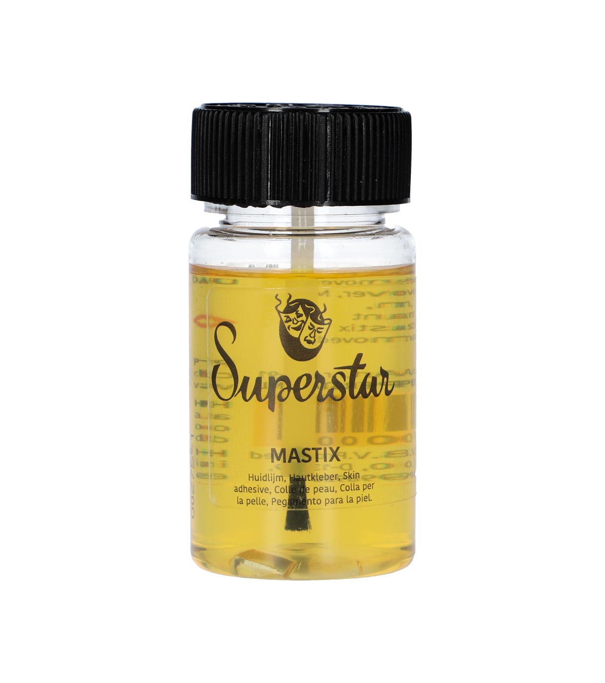 El Superstar Mastix es un popular adhesivo cutáneo para pegar prótesis de látex, barbas, bigotes, pelucas y piedras preciosas.