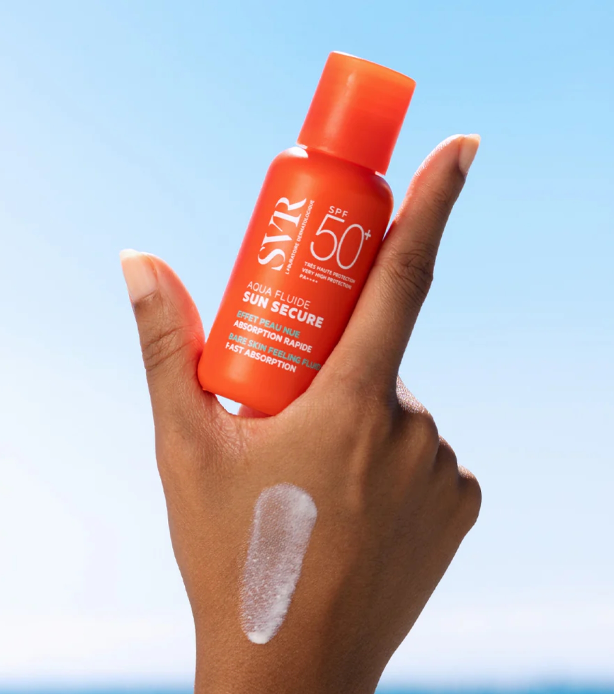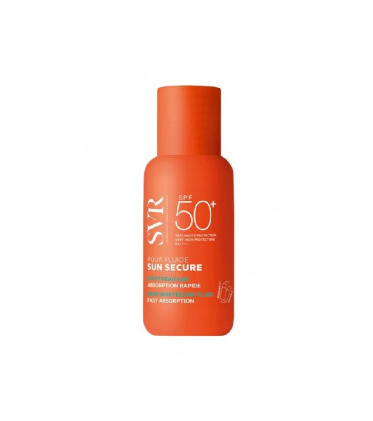 Descubre el protector solar SUN SECURE Aqua Fluide SPF50+ de SVR, un protector solar de textura ligera que se absorbe rápidamente y deja un acabado invisible, sin sensación grasa ni manchas blancas.