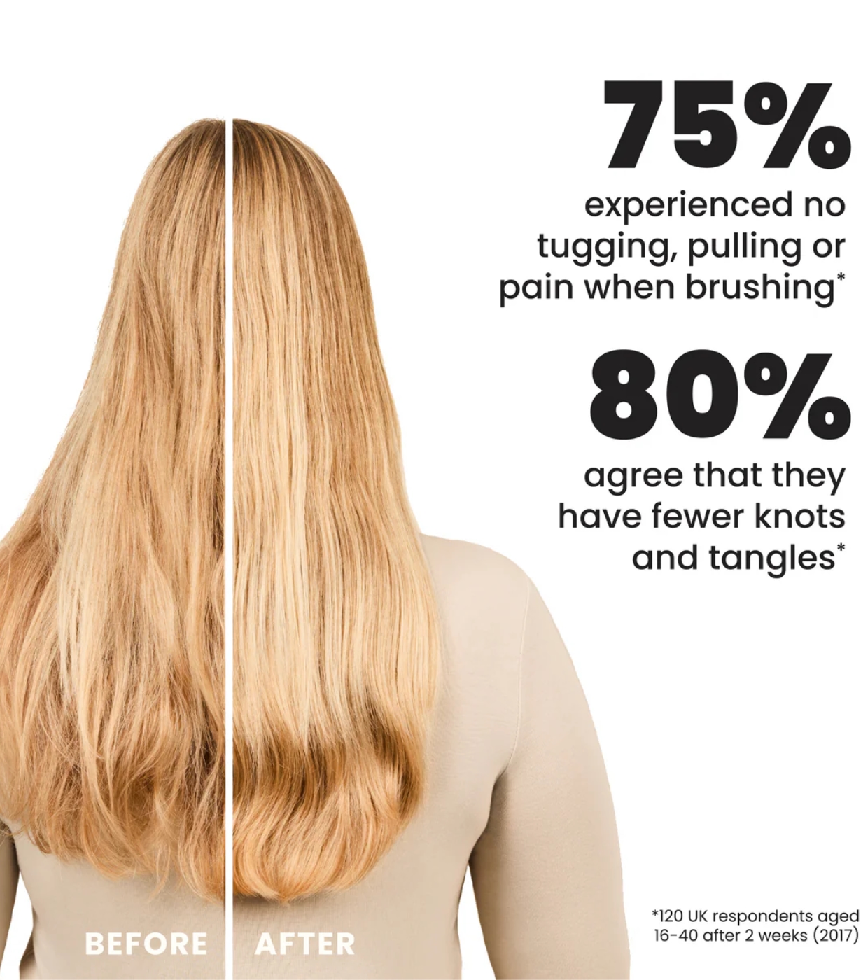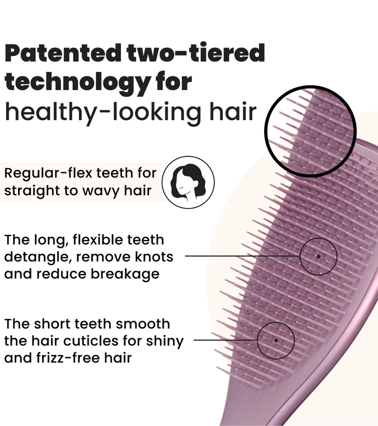 Con sus 325 púas flexibles de dos niveles, desenreda suavemente el cabello en seco o mojado, minimizando la rotura y reduciendo el frizz.