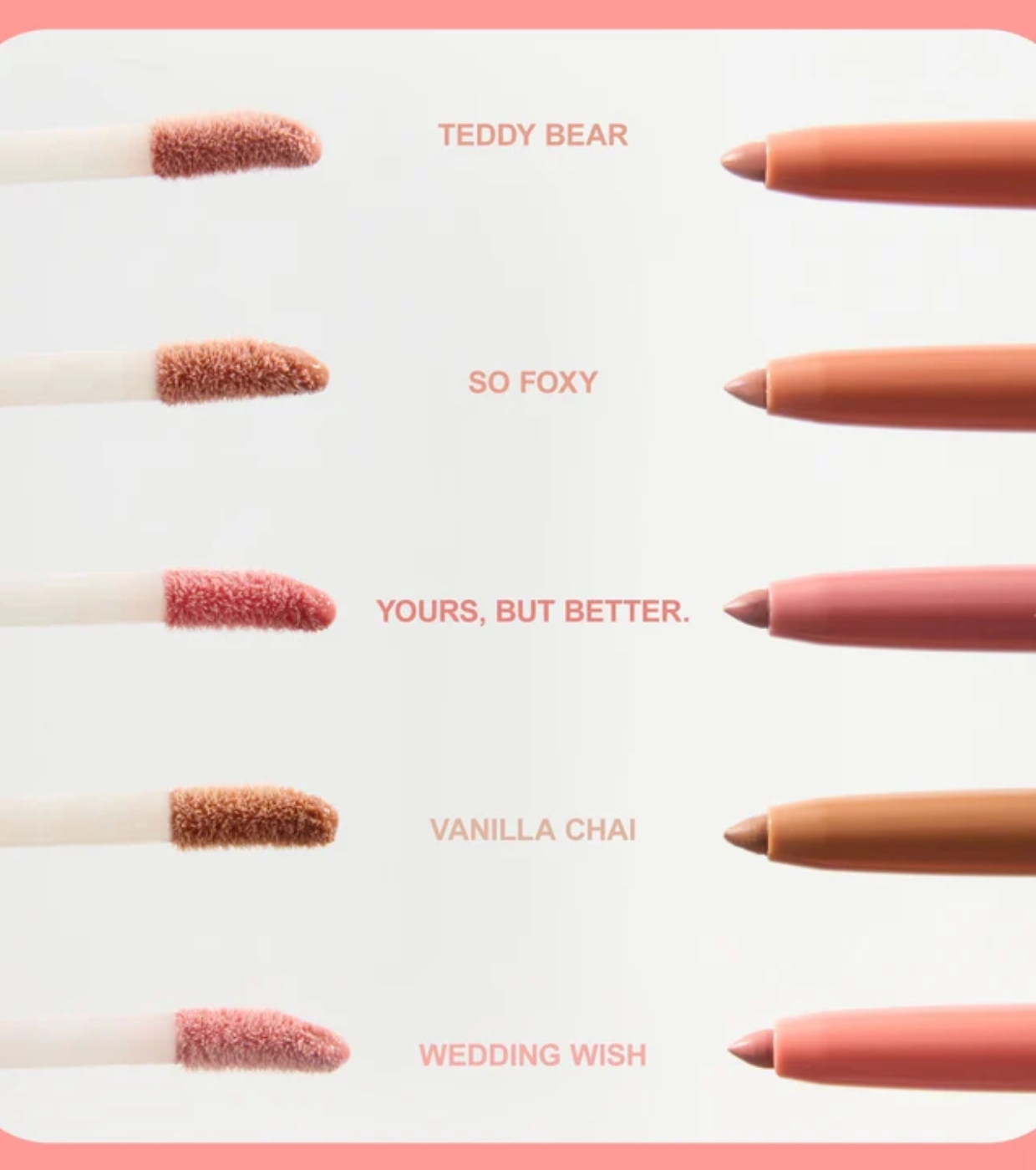 - Delineador cremoso y difuminable: se desliza con suavidad para definir los labios sin esfuerzo, dejando un acabado mate y aterciopelado.